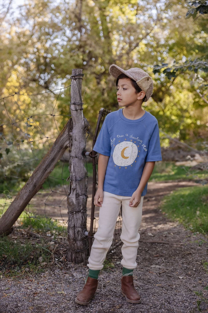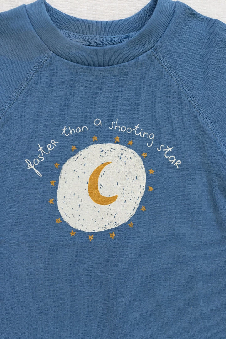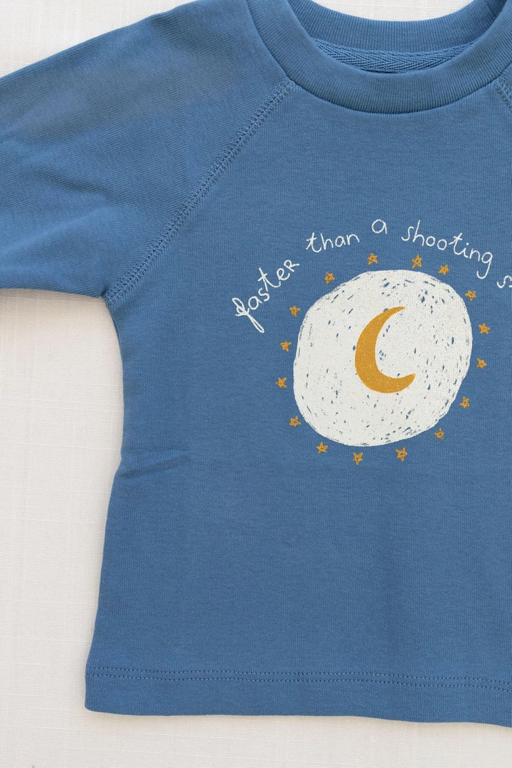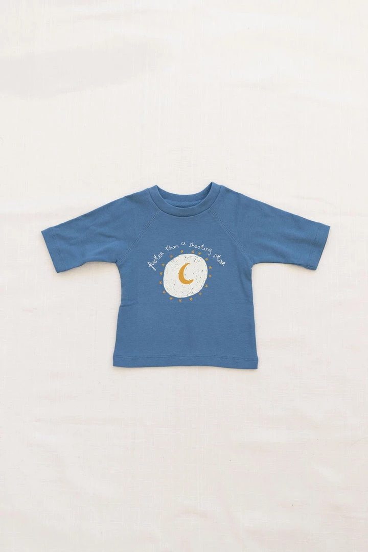 essential grab and go graphic tee featuring a moon surrounded by shooting stars reminiscent of reading under the stars with casual style in this seasons vintage blue, great to pair with any bottoms of your choice to accommodate all adventures