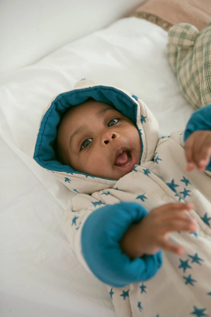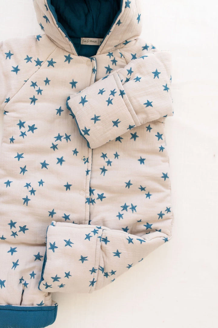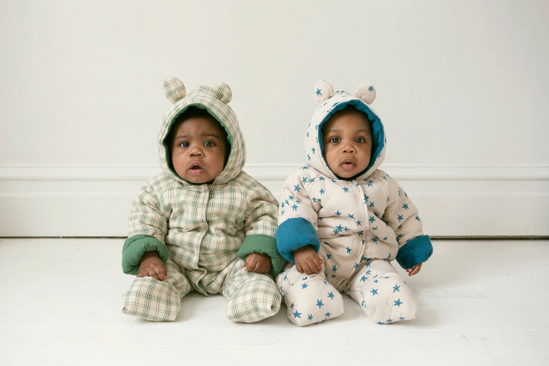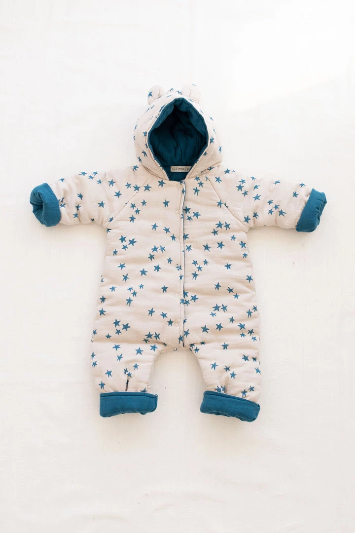 serves as an insulated layering piece to add to baby’s winter wardrobe, dangles the most adorable and fitting bear ears on hood, buttoned bodice and optional mittens for chilly fingers and toes