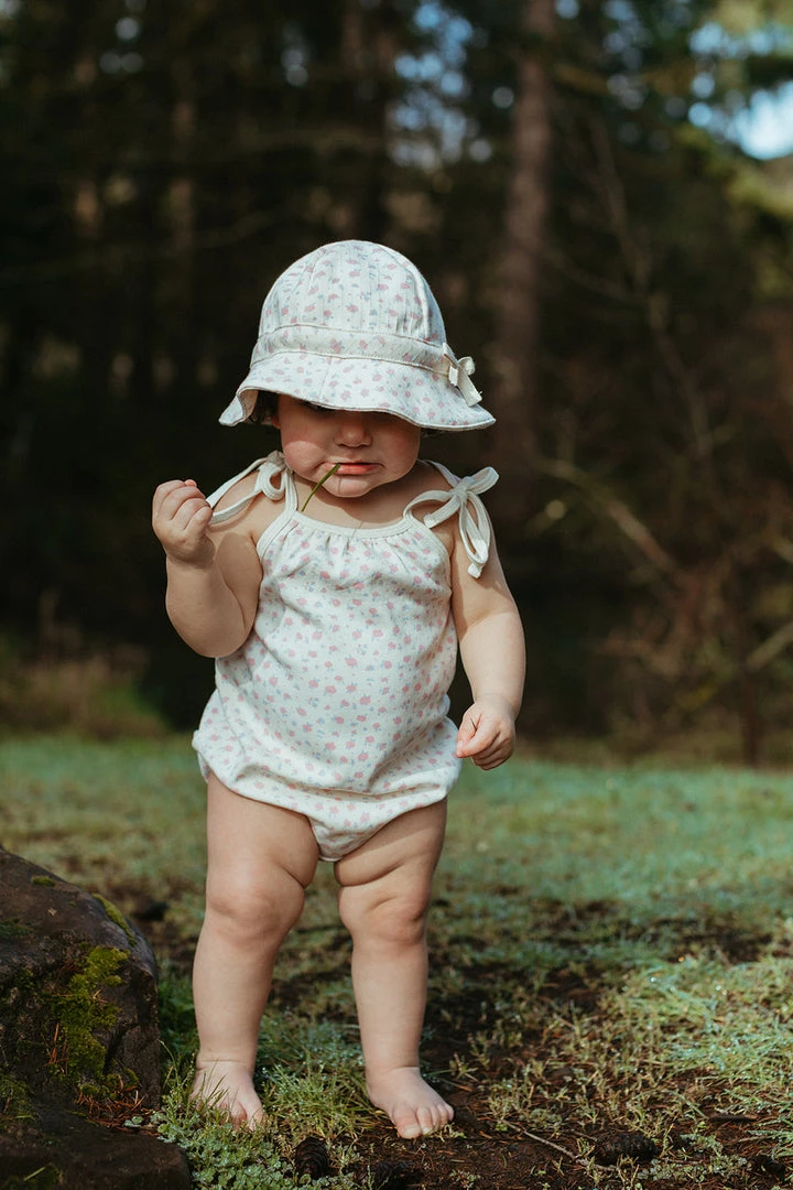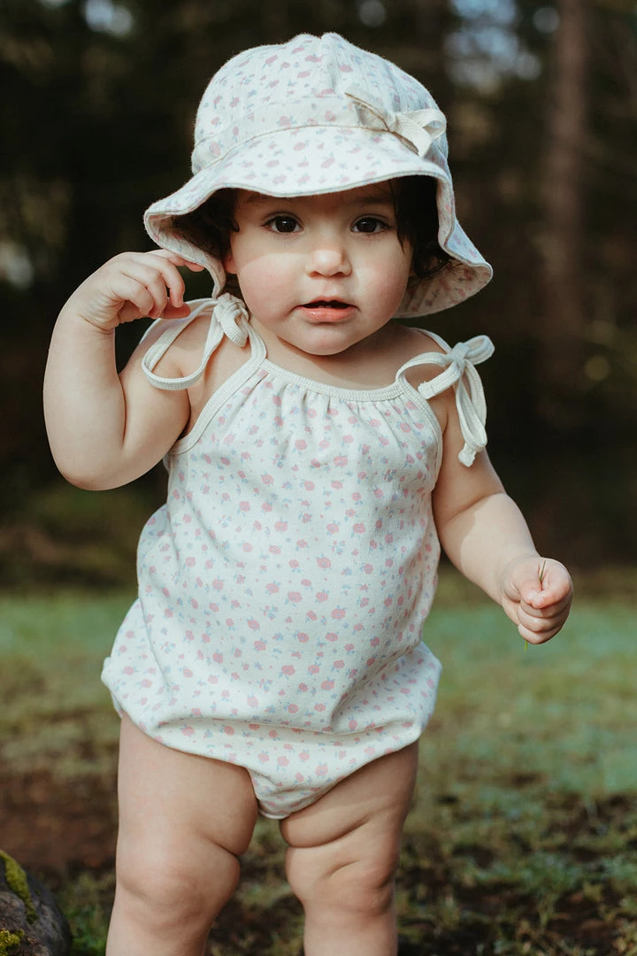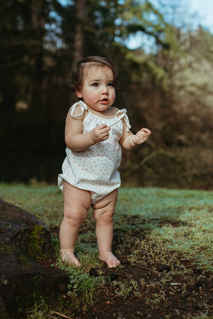 a warm weather wardrobe staple in our signature retro style featuring an oversized bubble-like fit with contrasting trim for added dimension, manual ties at shoulders, soft and comfortable leg holes with snaps in place for efficient diaper changing