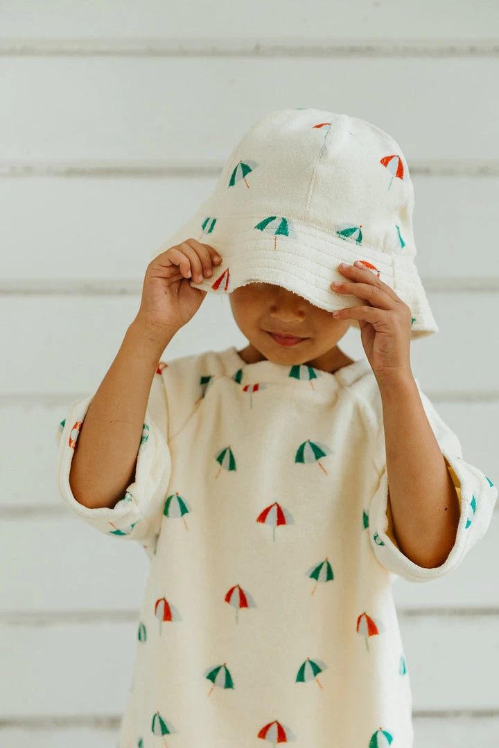 a retro-inspired accessory staple in a terry cloth floppy bucket hat with frayed edges for added style, features a versatile brim to keep your littles safe from extended fun in the sun, flip at any angle you desire depending on coverage needs, features a flexible breathable fabric that is easy to fold and pack on the go