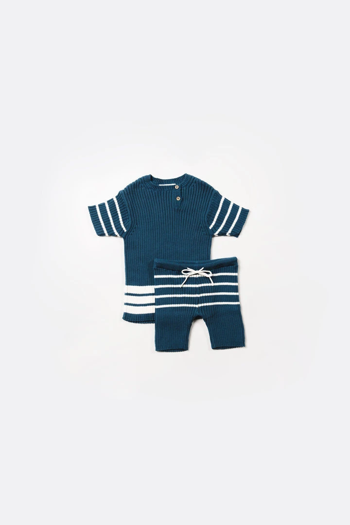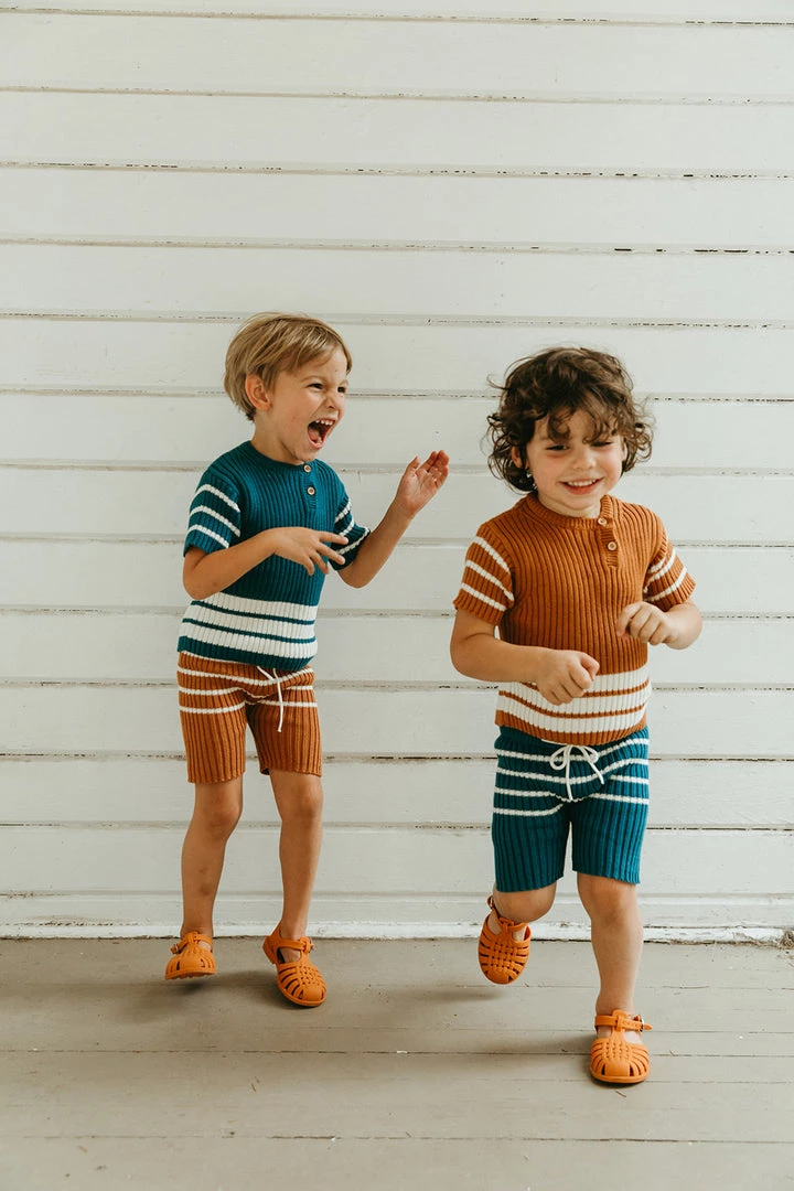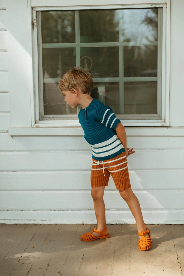 the heritage knit top in a slinky fun knit fabrication with practical essence making it the perfect wear everywhere top, features classic stripe detailing, ribbed texture throughout with a round neck design including functional wooden buttons at collar to assist with dressing