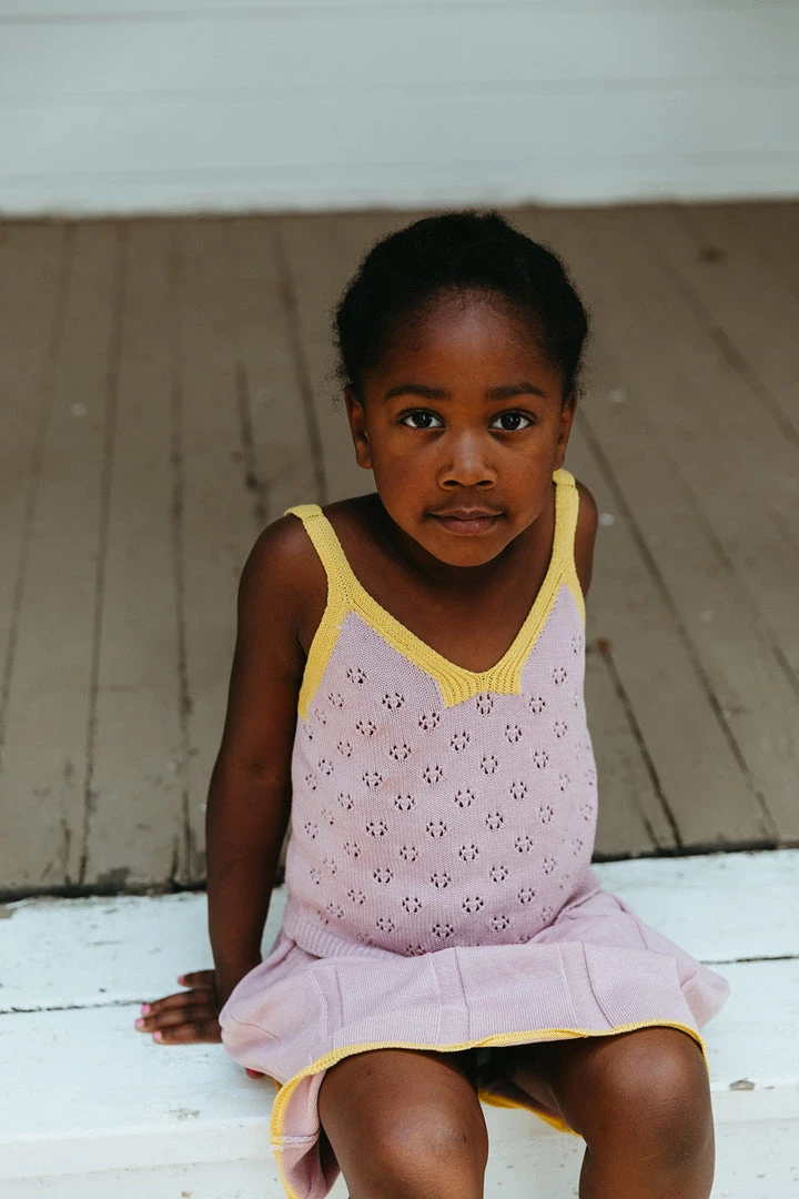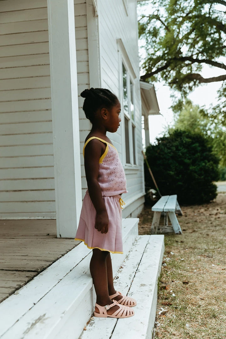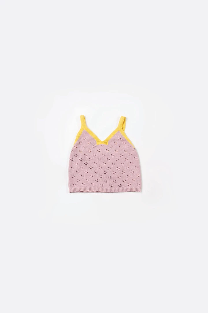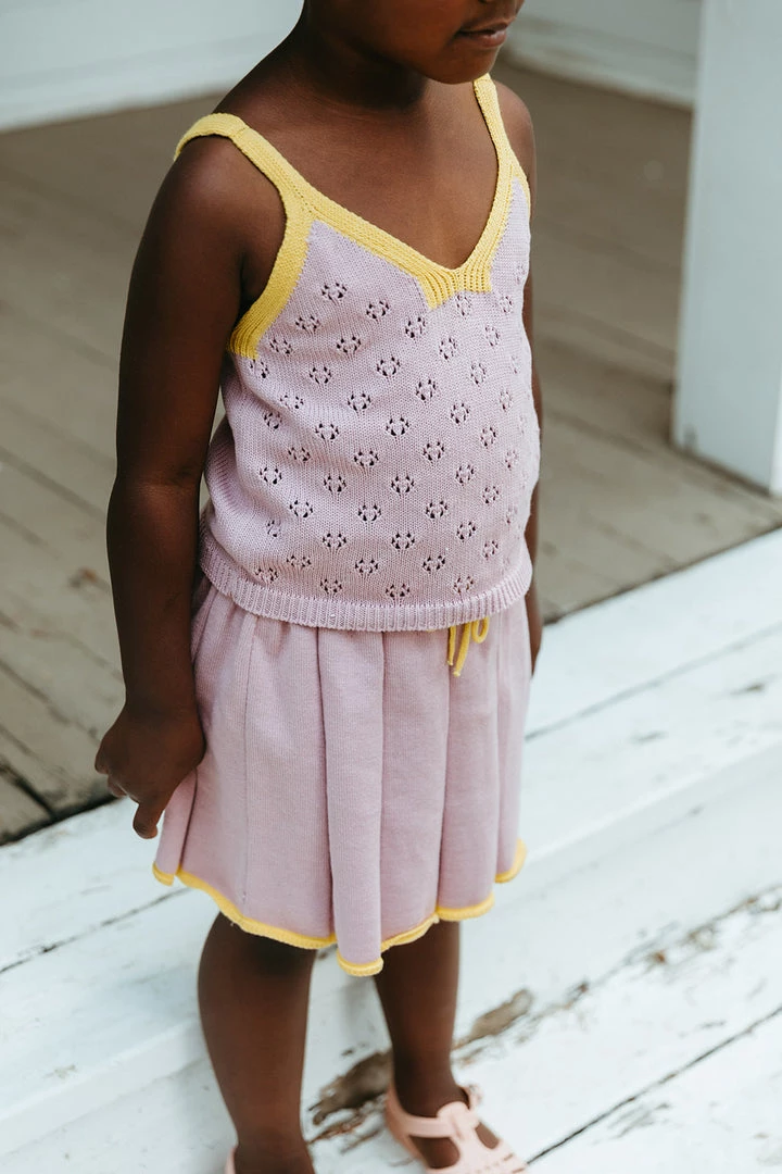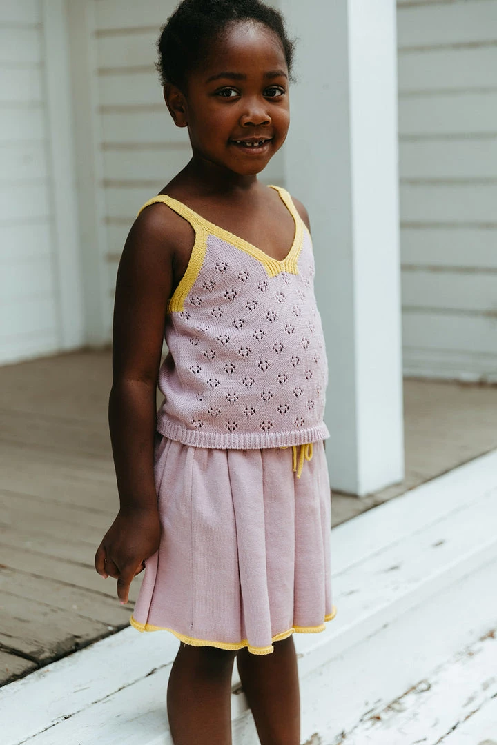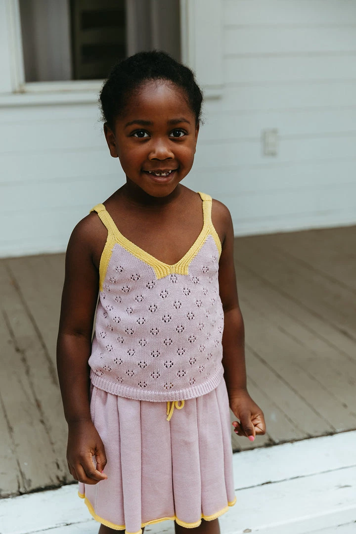 meet our new matilda tank! featured in a breathable knit fabrication that will take your little girl from spring to summer seamlessly, has a v-neck design with a open knit details throughout, can be worn layered or worn alone depending on coverage or style needs, the pretty contrast straps add just the right touch