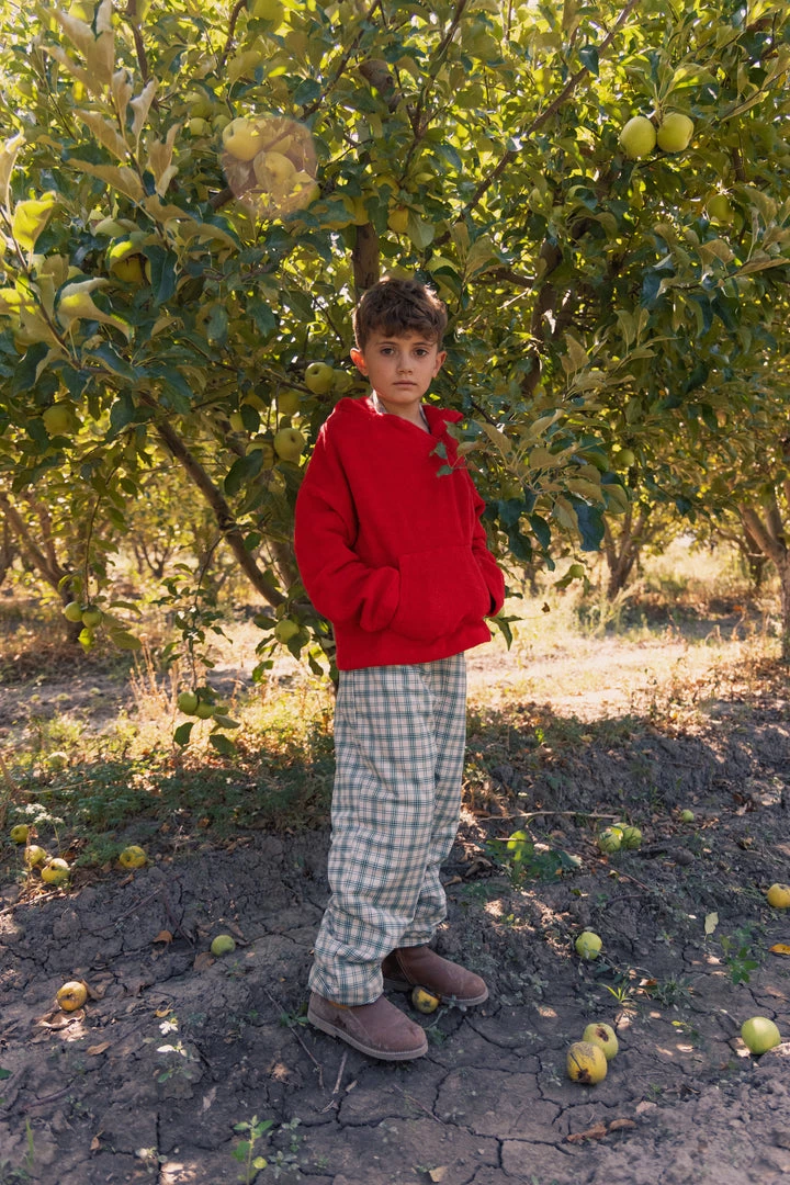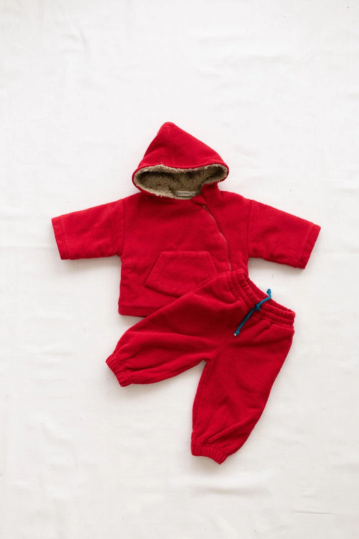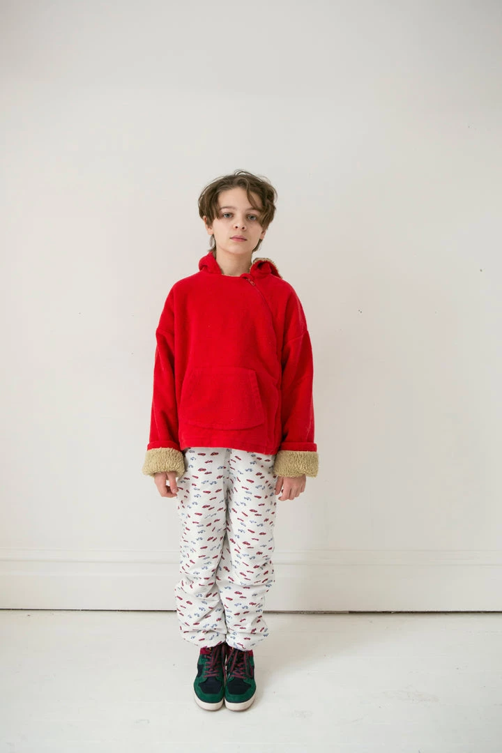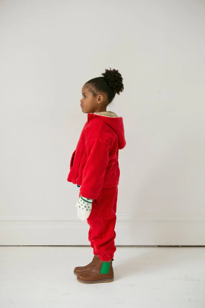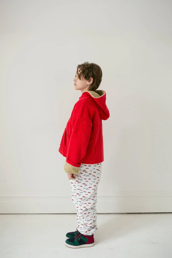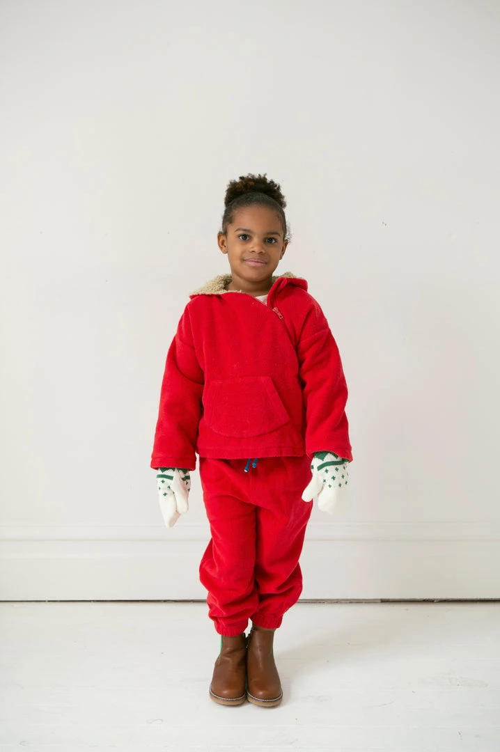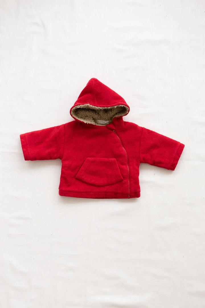 relaxed fitting hooded essential with soft fleece fabrication and warm sherpa hood lining, pouch front pocket for chilly hands and off centered buttons for closure