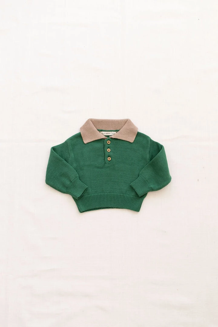 timeless knit sweater with neat collared neckline, long sleeves and banded hem, pairs well with denim jeans or salopettes!