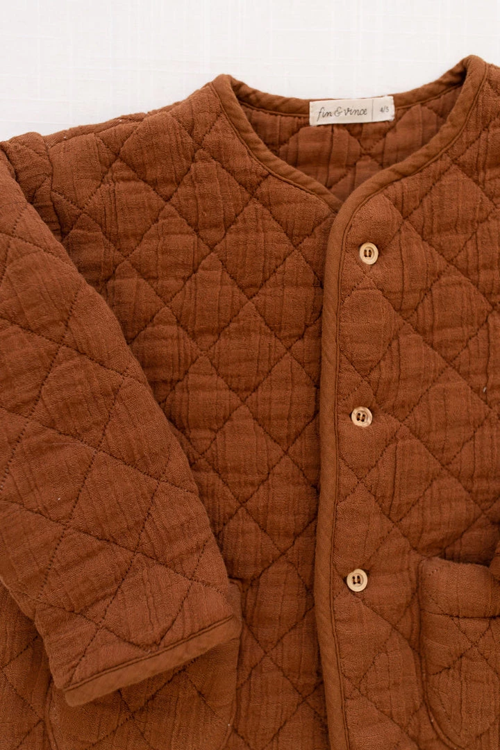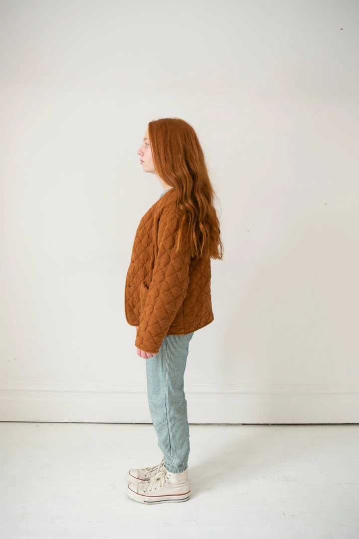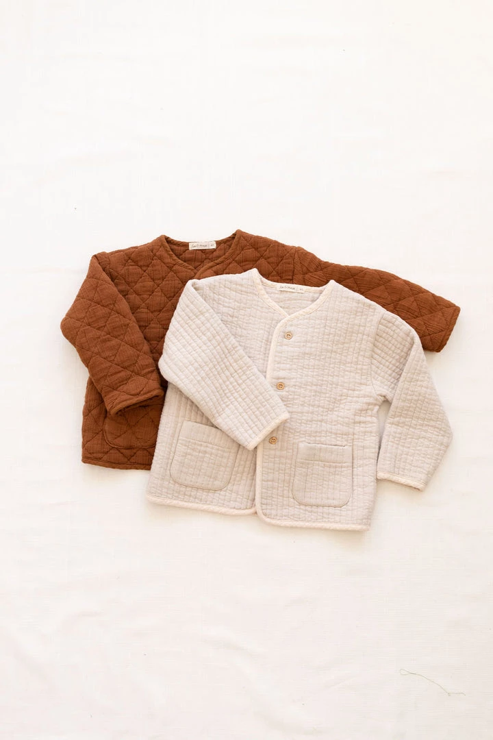 darling quilted fabrication transitions well throughout the seasons, rounded hem for dimension, complimented with wooden buttons and adorable double front pockets