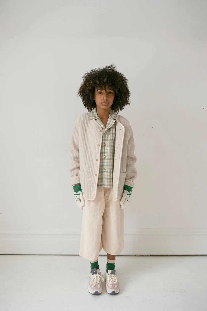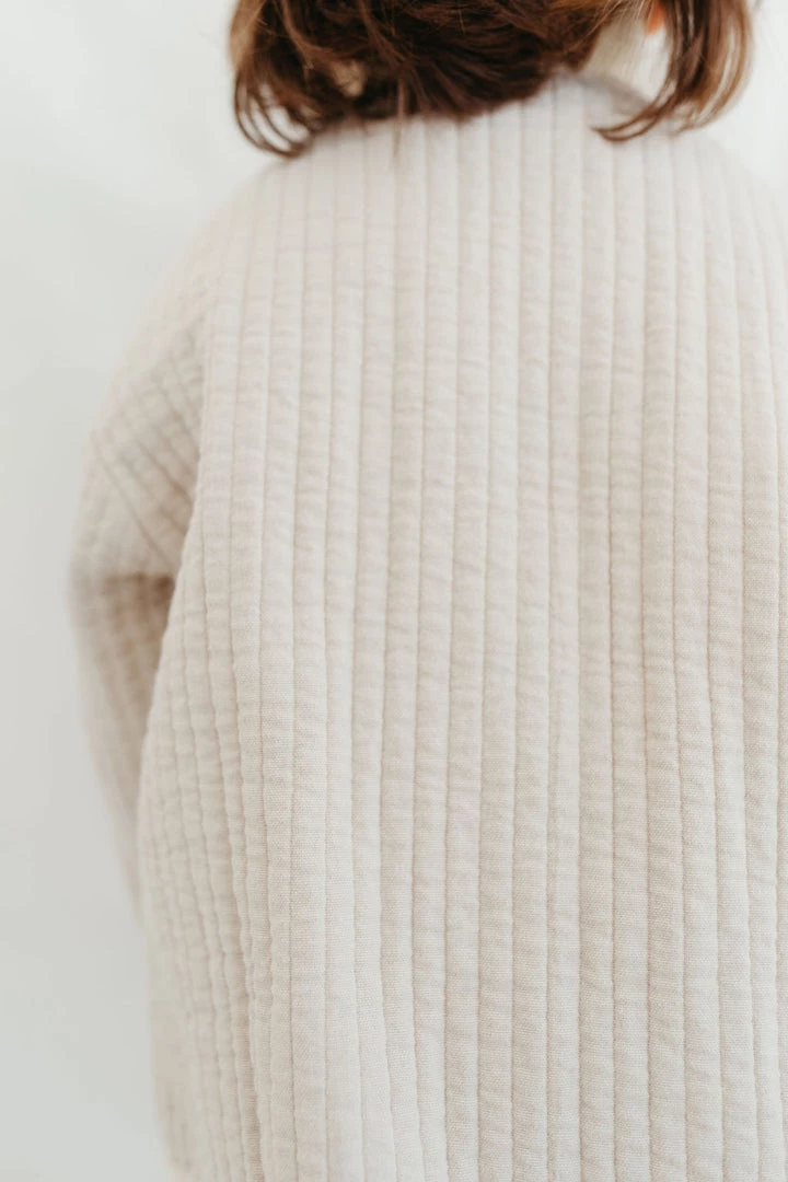 darling quilted fabrication transitions well throughout the seasons, rounded hem for dimension, complimented with wooden buttons and adorable double front pockets
