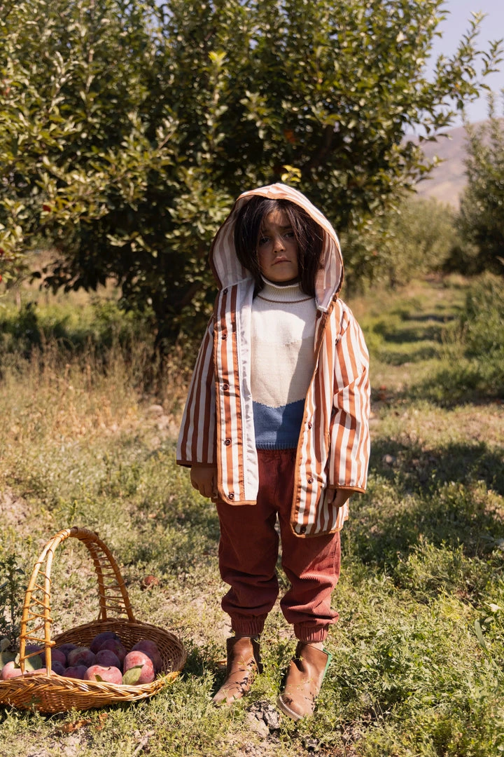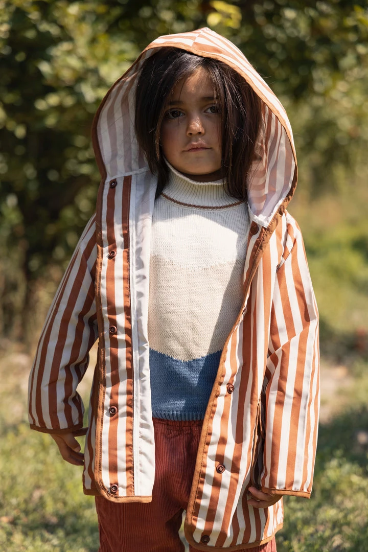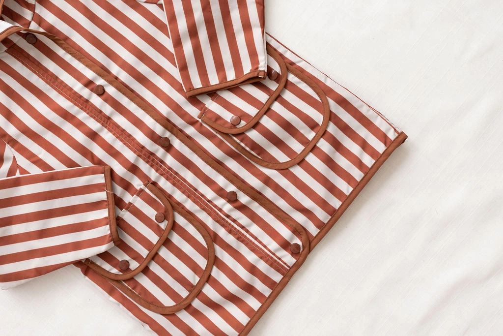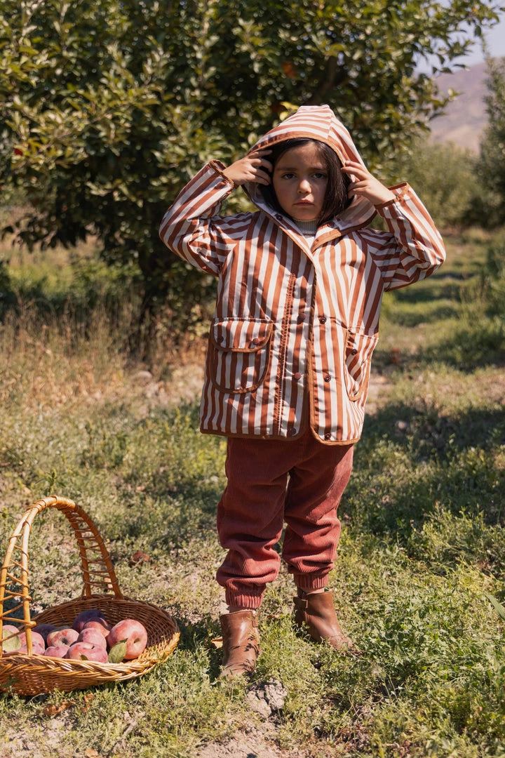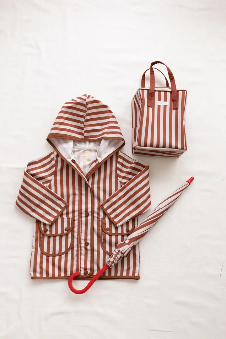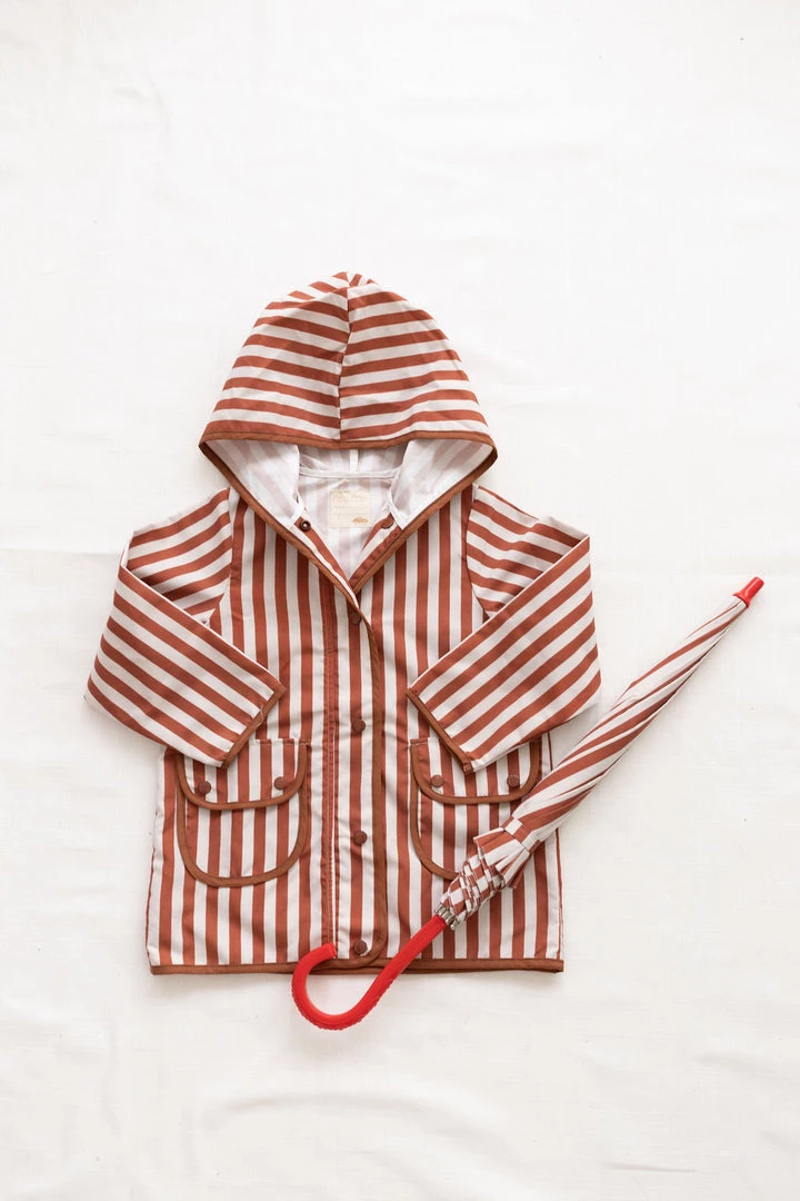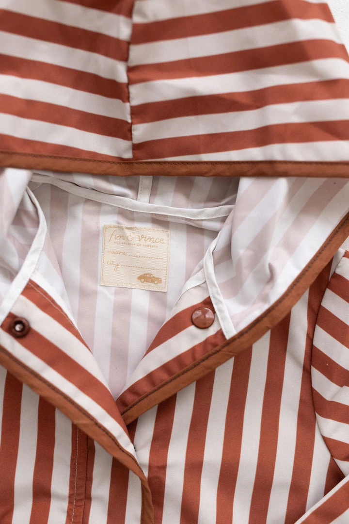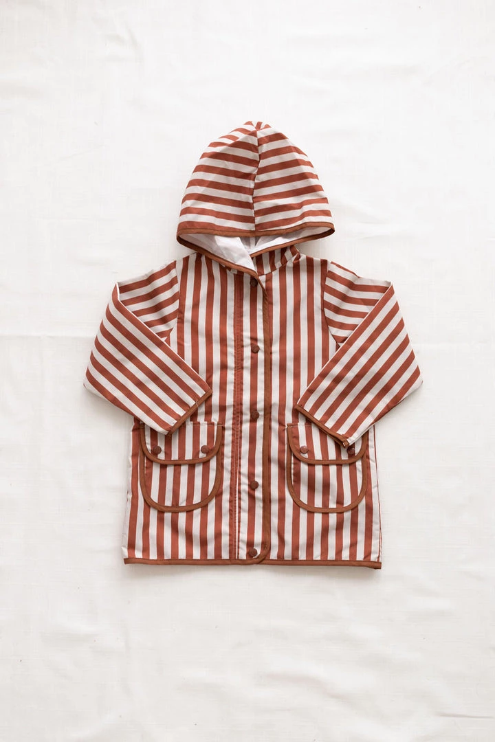 hooded retro rainfall staple accentuated with contrast trim and buttons, two functioning front pockets with double snap closures keep your treasures dry, grab a marker to help your children write their name and city for a personalized touch!