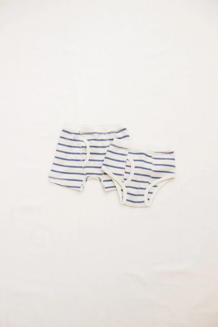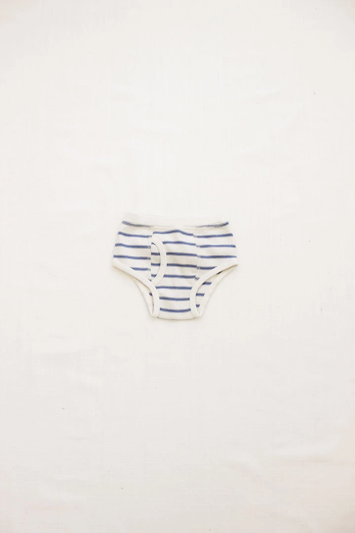 Our take on a classic flap front underwear brief. Featuring a classic ticking stripe in vintage blue.