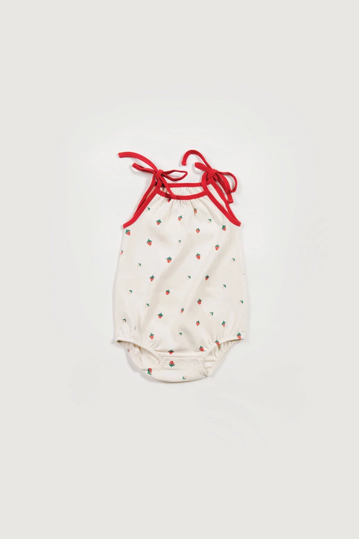 a warm weather wardrobe staple in our signature retro style featuring an oversized bubble-like fit with contrasting trim for added dimension, manual ties at shoulders, soft and comfortable leg holes with snaps in place for efficient diaper changing