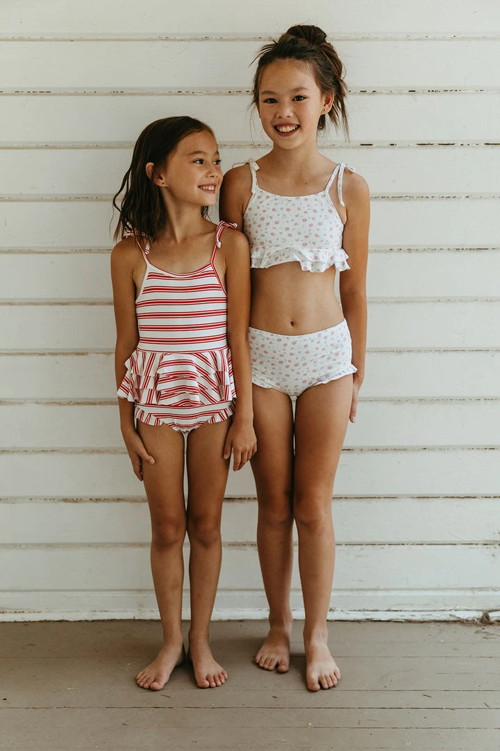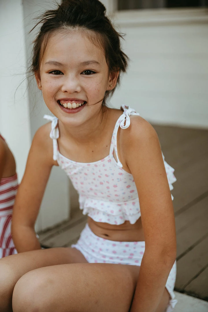 ruffled bikini in a tasteful on-trend two-piece with tank and high waist shorties offering full coverage on both the top and bottom, features a quick drying fabric that is fully lined for comfort, adjustable ties at the shoulder for a custom fit