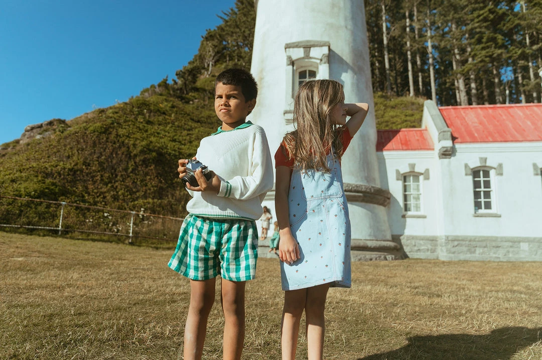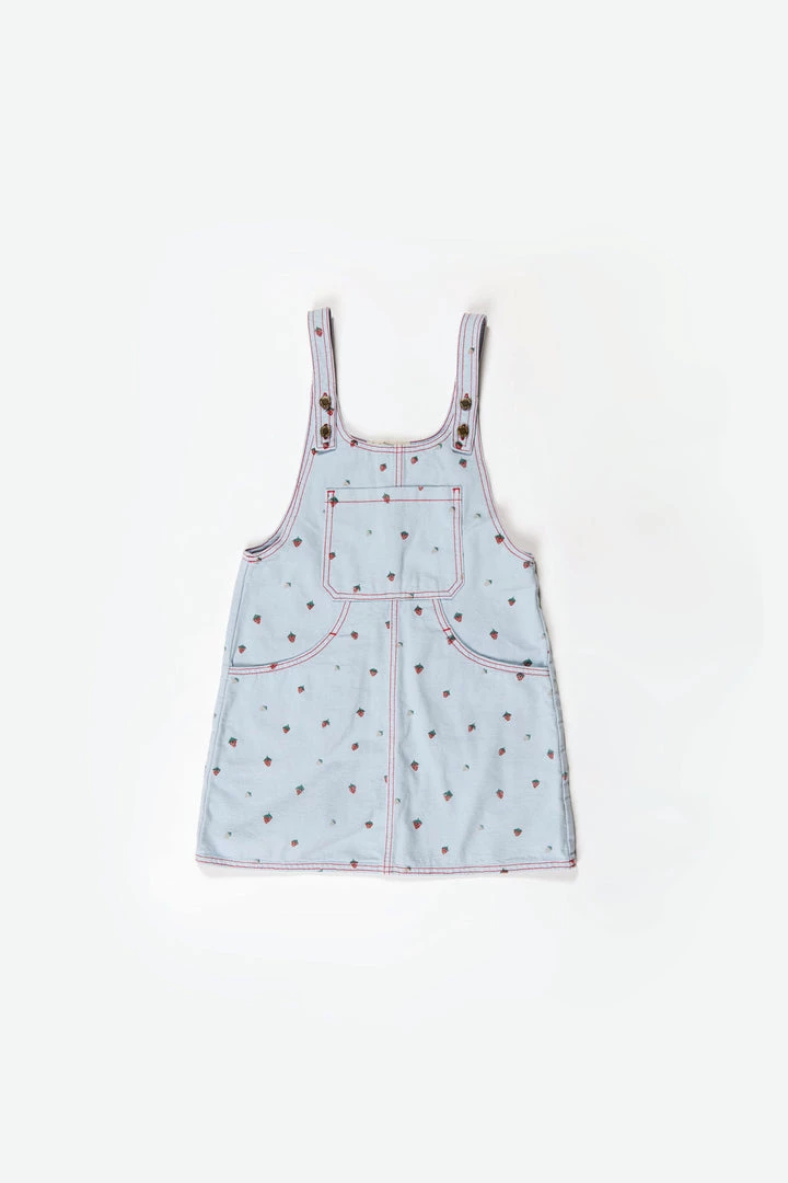 cool-weather staple in woven fabric, has center front pocket on the classic bib and functional handy front pockets on the skirt, adjustable straps with classic buttons, contrast stitching throughout to highlight the piece, pairs beautifully with our spring knits for added layers