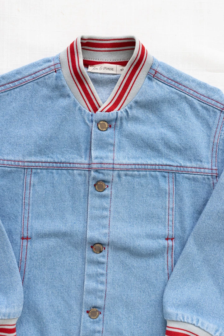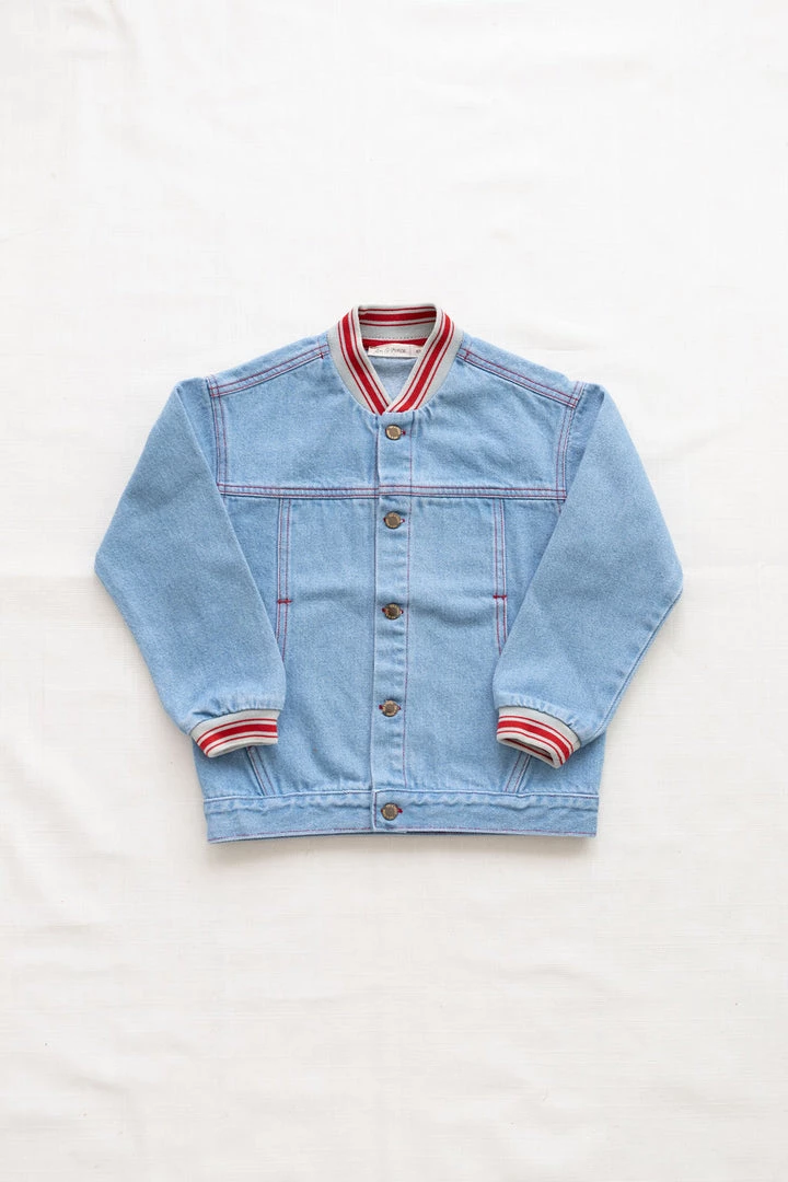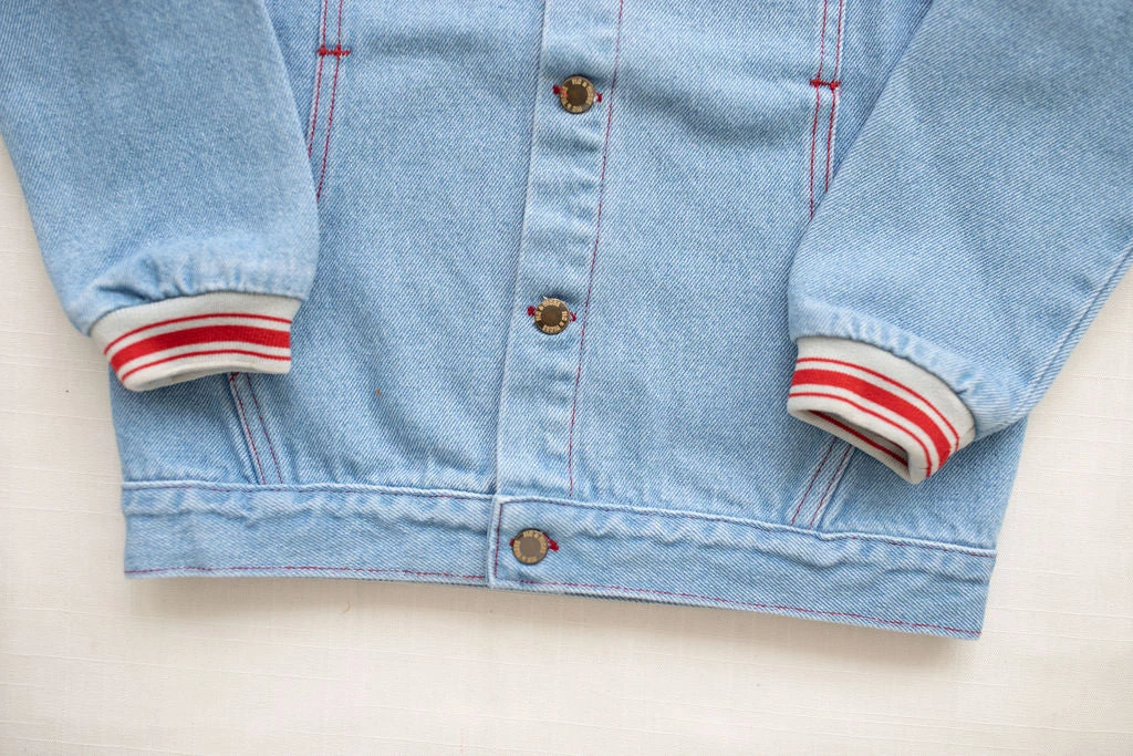 Classic denim jacket with a retro throwback twist. Brick red and milk contrast rib on the neckline and cuffs.