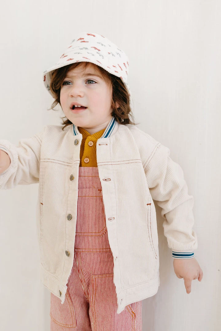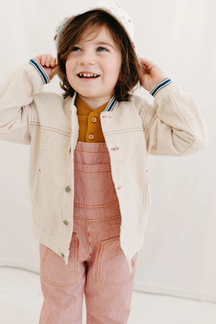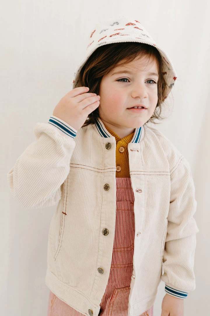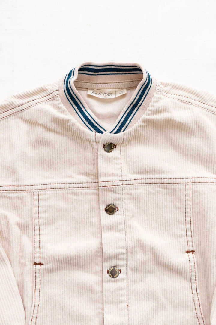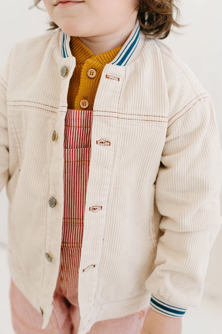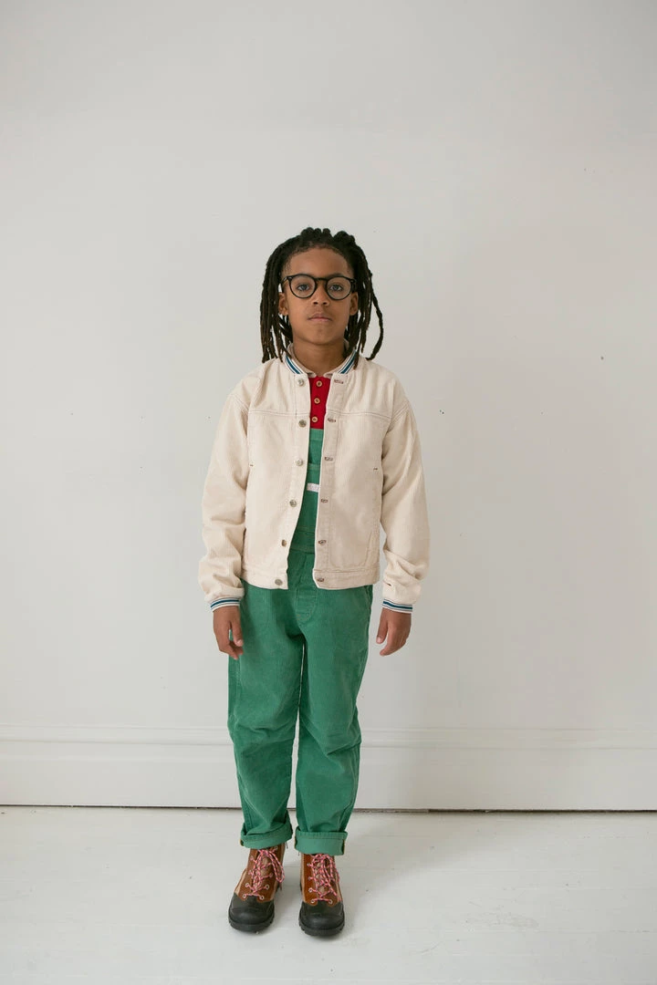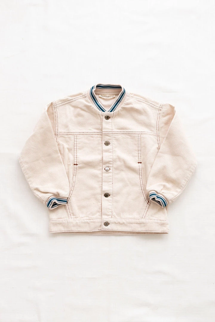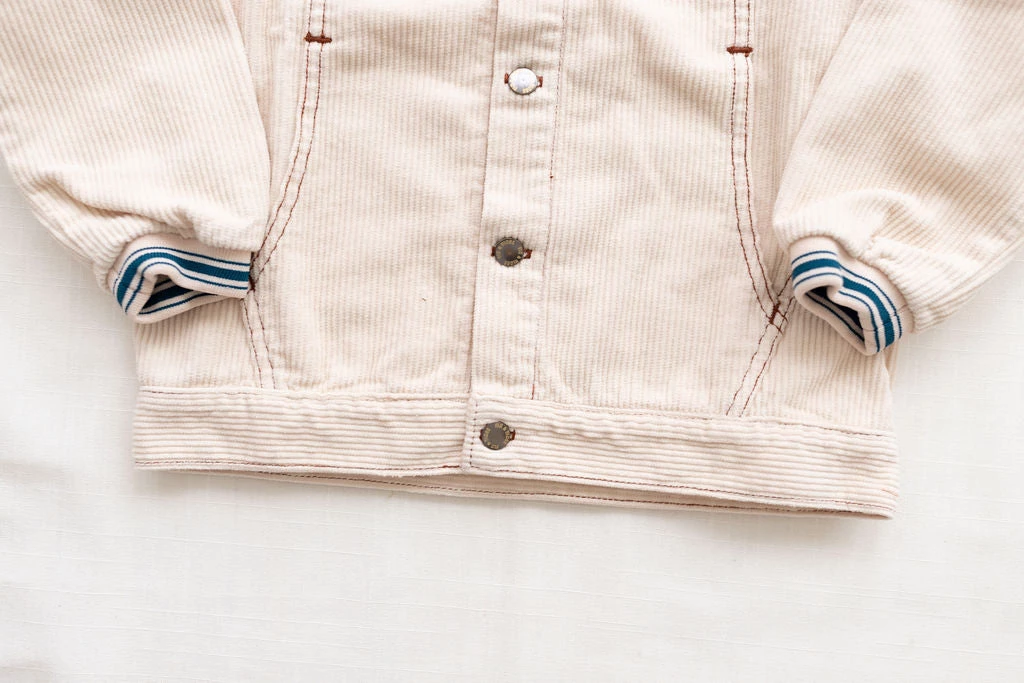 Classic denim jacket with a retro throwback twist. Milk and ocean blue contrast rib on the neckline and cuffs.