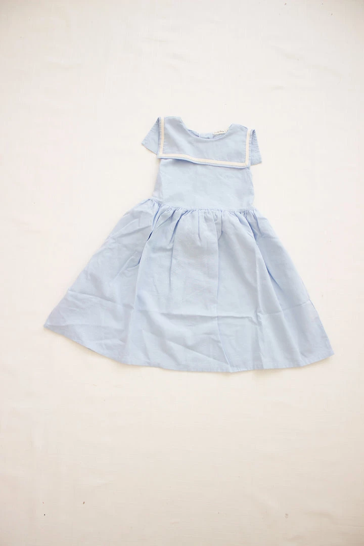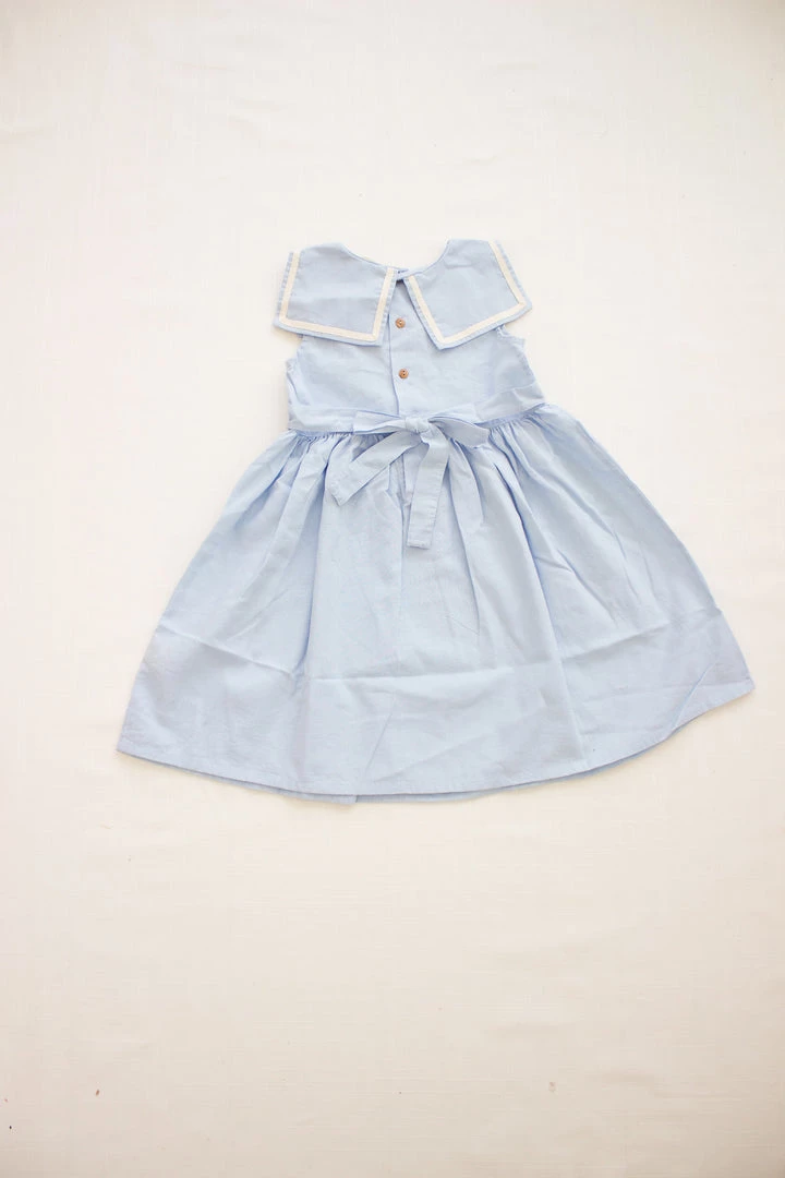 the sailor dress boasts sweet details such as a round neckline and classic sailor style bib that rests at the front and back with twirl worthy skirt defined by a tie that circles around back, wooden buttons for ease with dressing