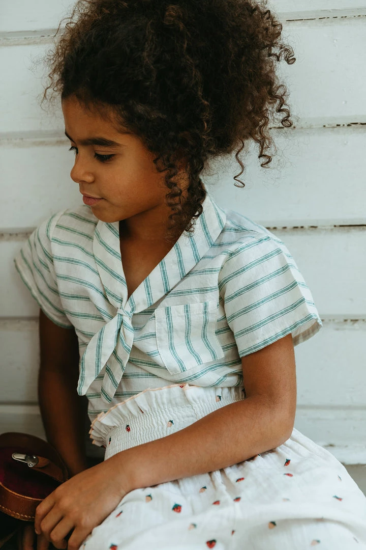 short sleeve tee with nautical stripe details featuring a classic sailor-style front knot collar and functional pocket at chest, pair with your choice of our signature seasons bottoms for a complete look