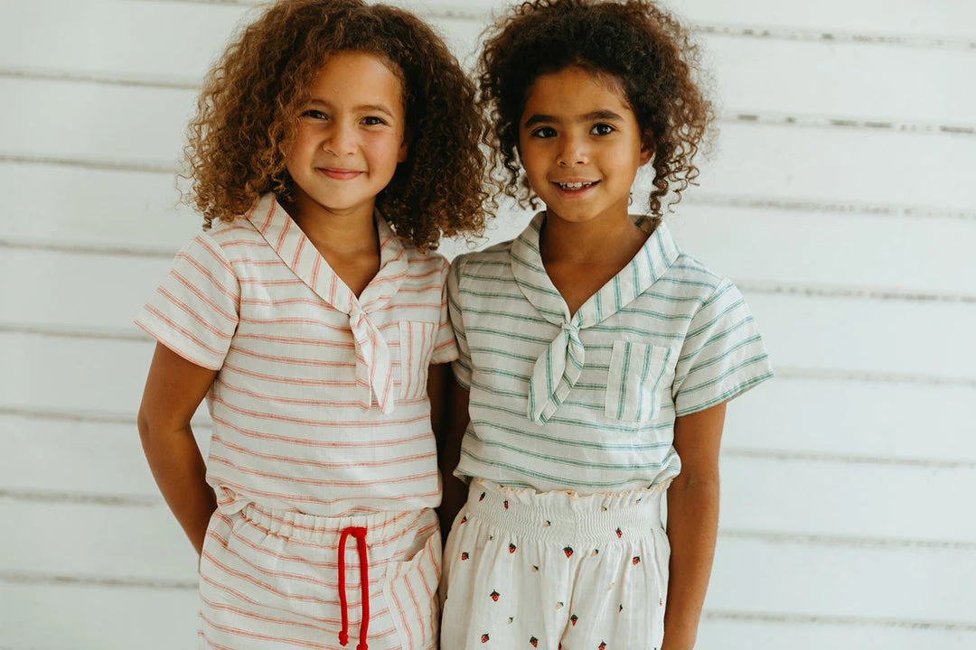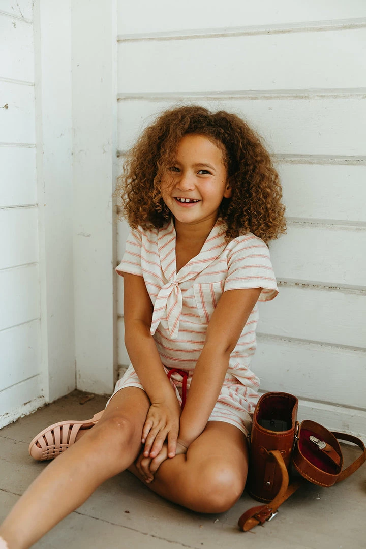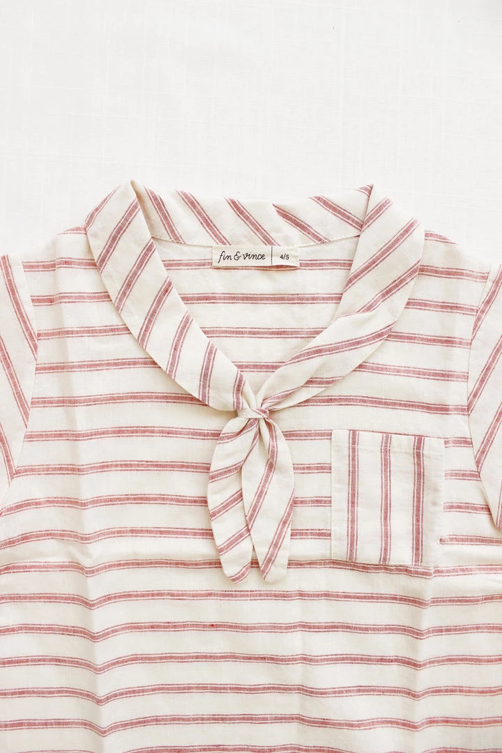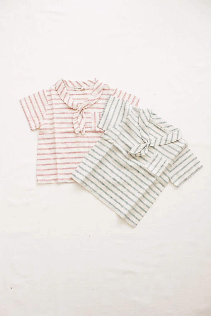 short sleeve tee with nautical stripe details featuring a classic sailor-style front knot collar and functional pocket at chest, pair with your choice of our signature seasons bottoms for a complete look