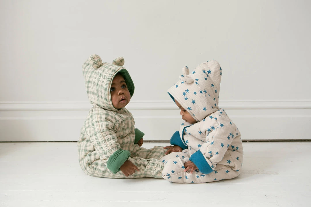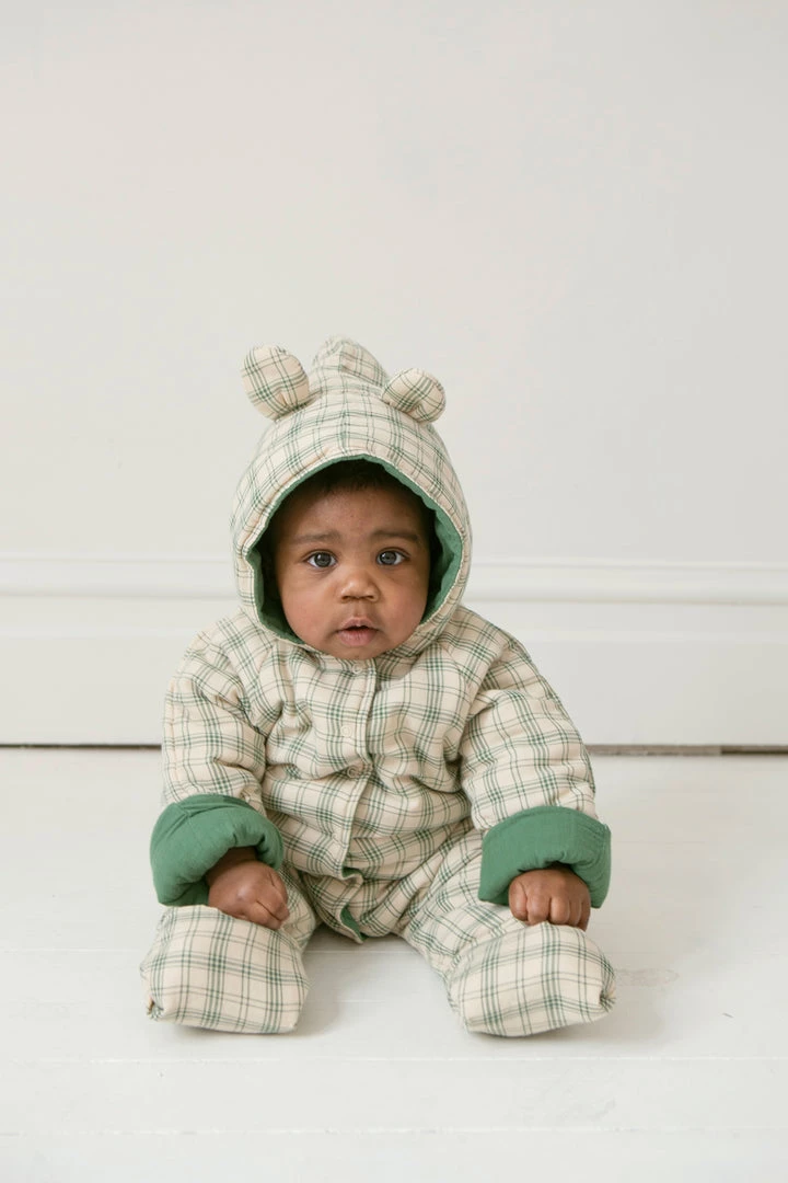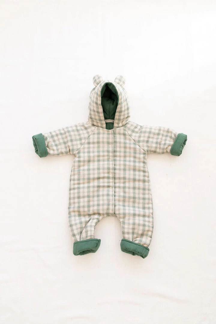 serves as an insulated layering piece to add to baby’s winter wardrobe, dangles the most adorable and fitting bear ears on hood, buttoned bodice and optional mittens for chilly fingers and toes