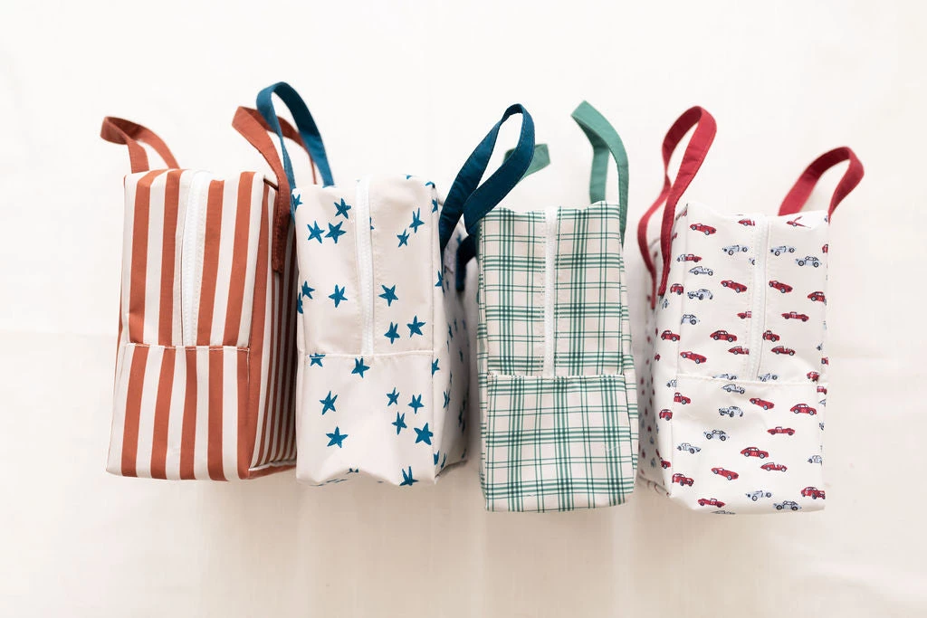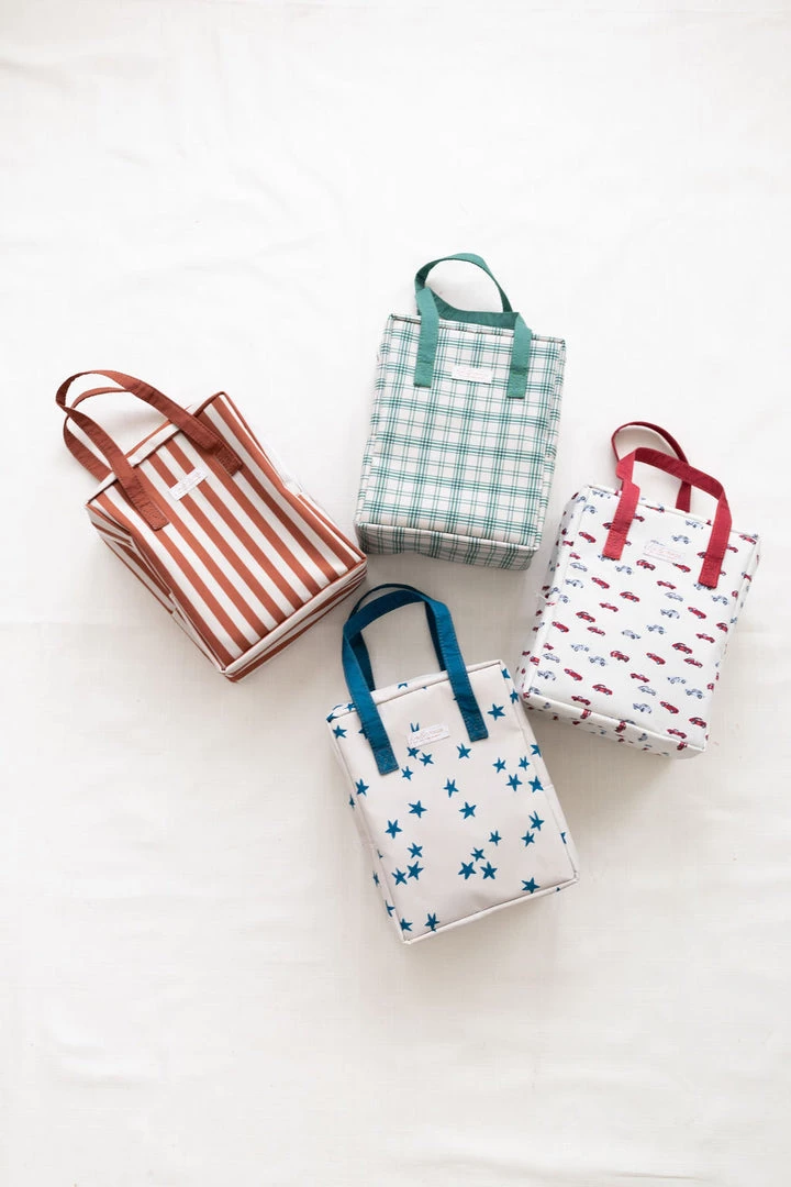 lunch time just got that much cooler with the introduction of our new insulated lunch boxes! features include a half zipper that secures contents, wide double handles provide a sturdy hold with leak resistant interior that can easily wiped clean, prints coordinate with your little ones favorite outfits