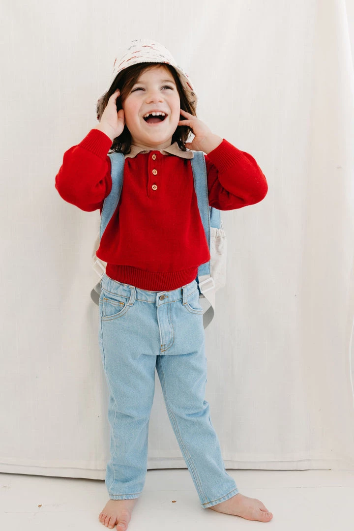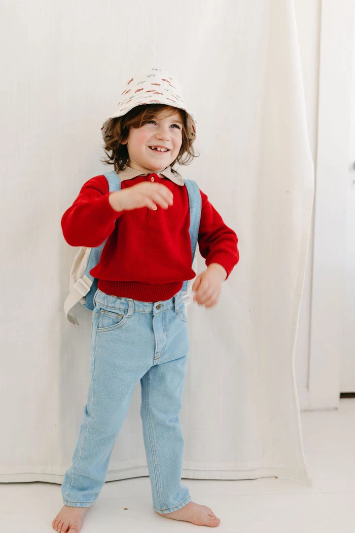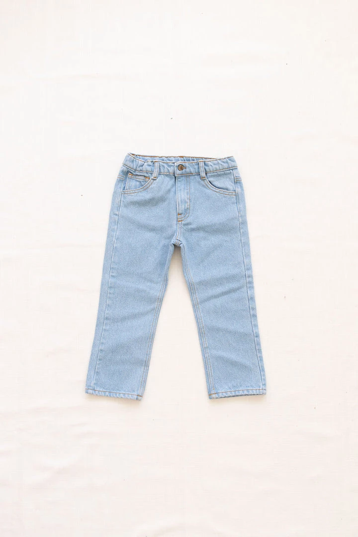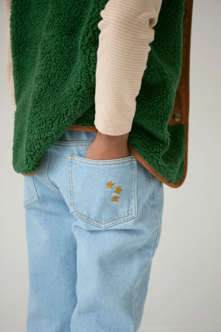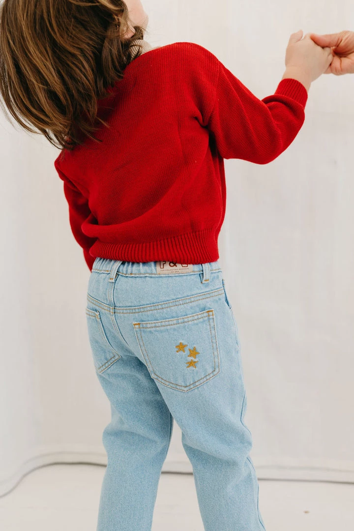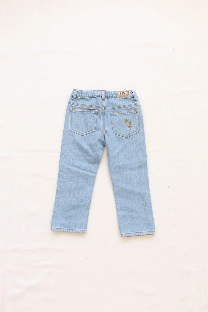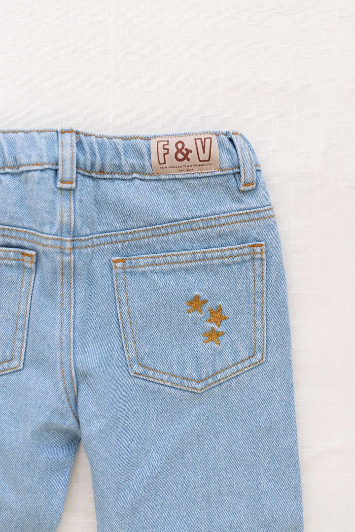 retro-inspired jeans featured in a forever timeless straight-leg design, four practical pockets, adjustable waistband and goldenrod stars embroidery on back pocket coordinating with season favorites, stamped with fin & vince logo tab
