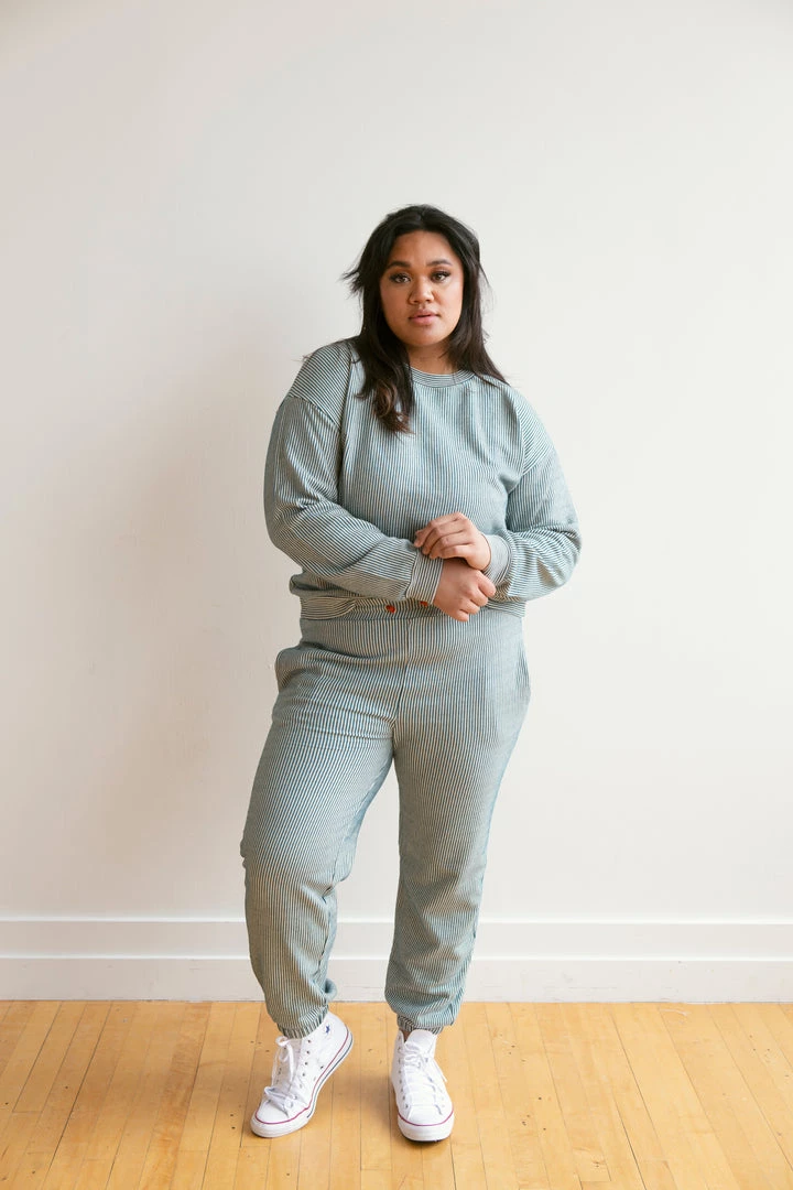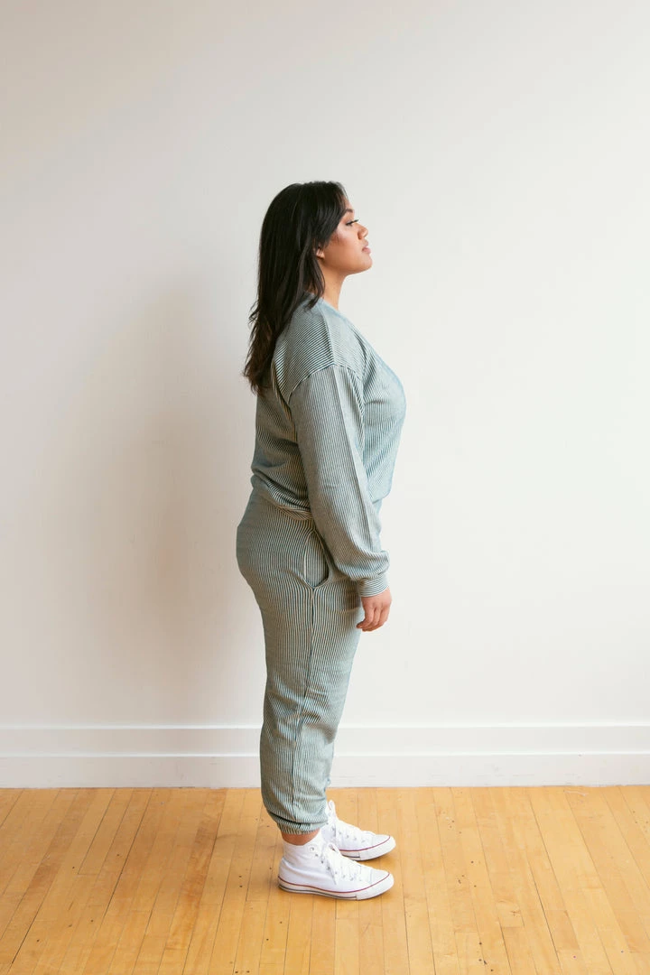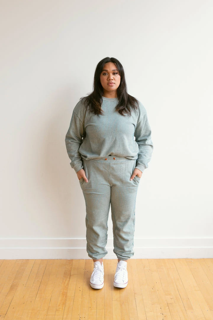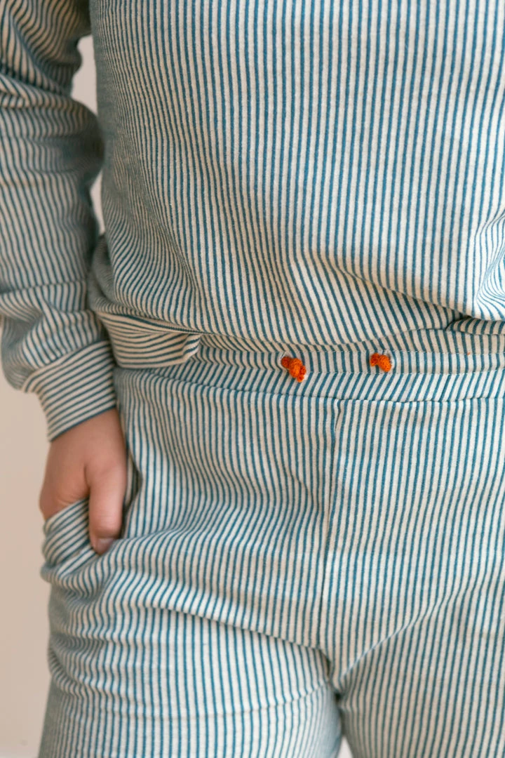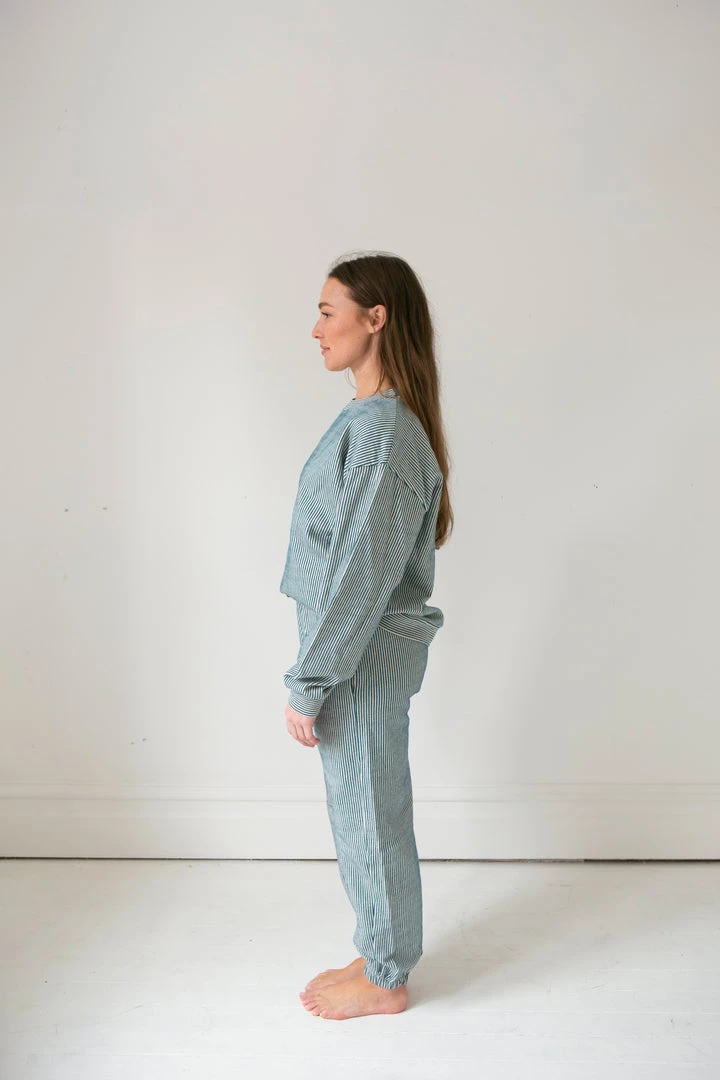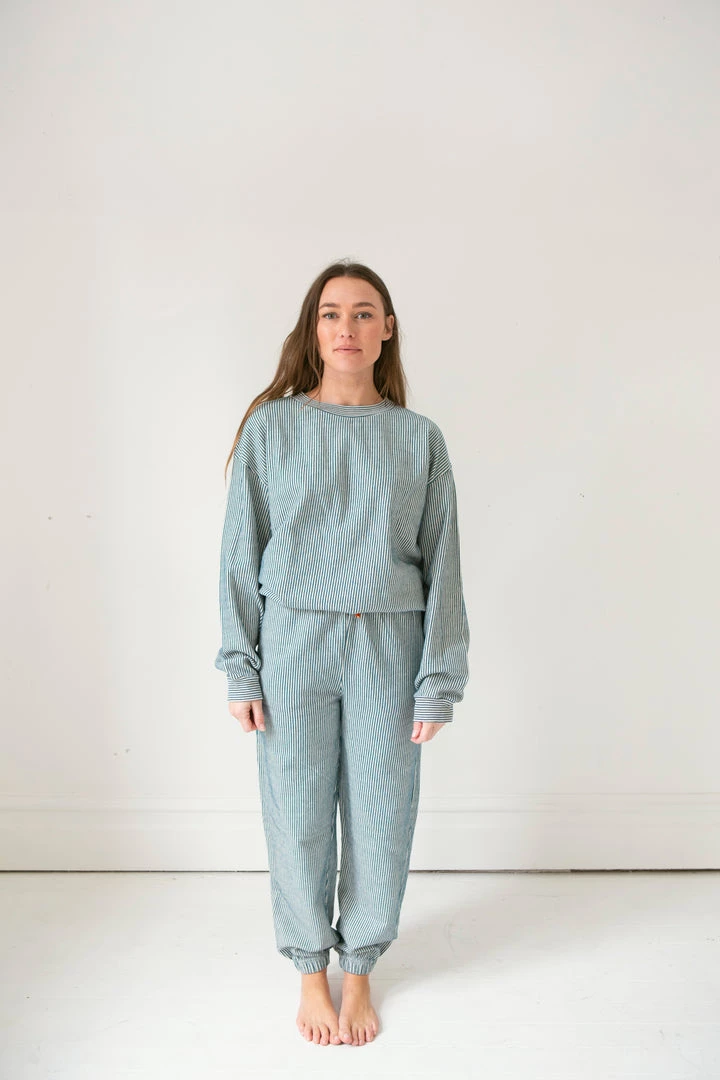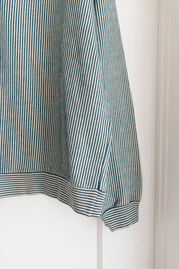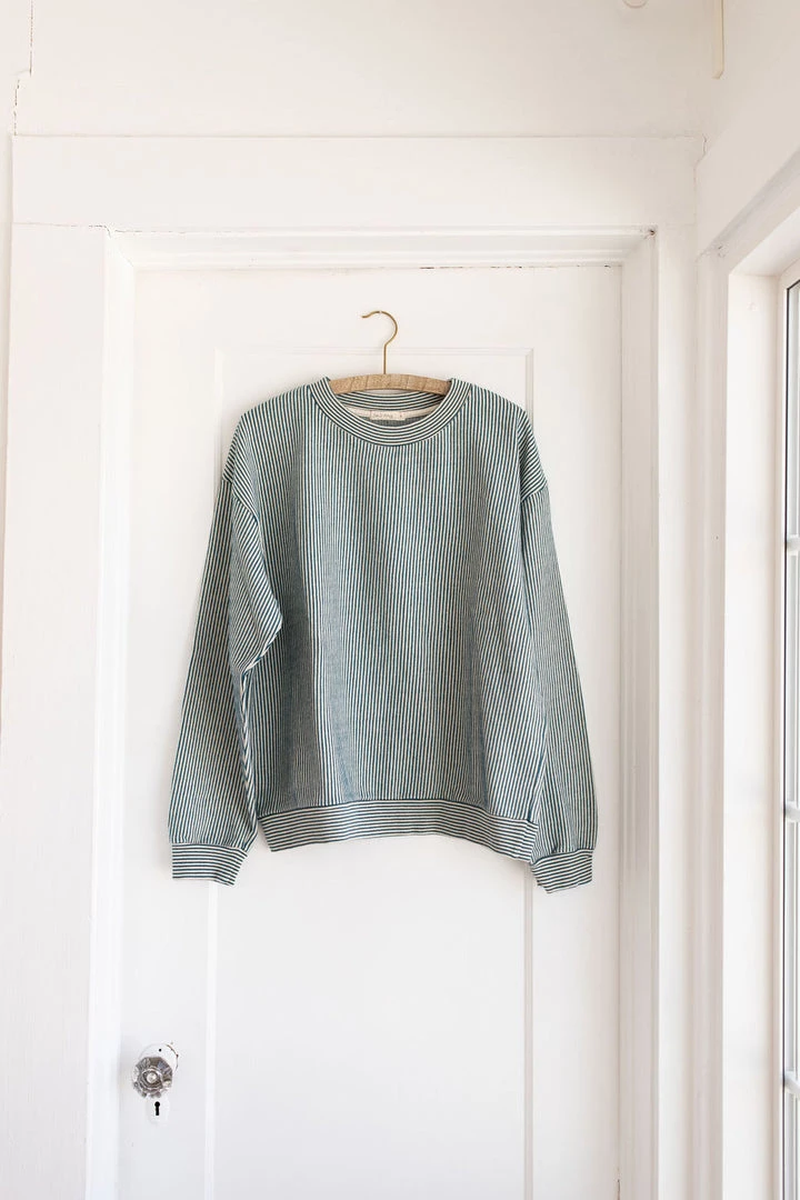 french terry softness in our effortless crew neck pullover sweater, gorgeous ocean pinstripe details and banded hem for added shape