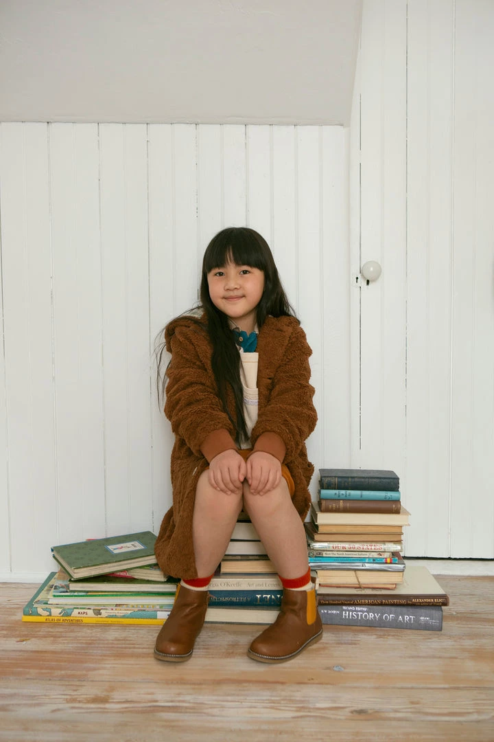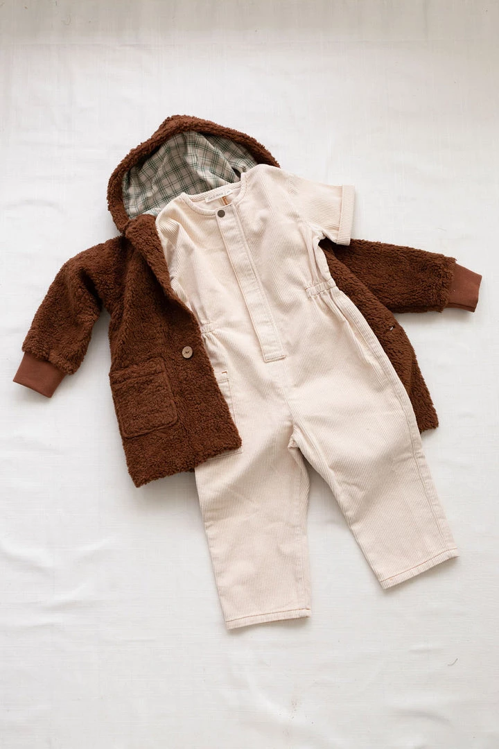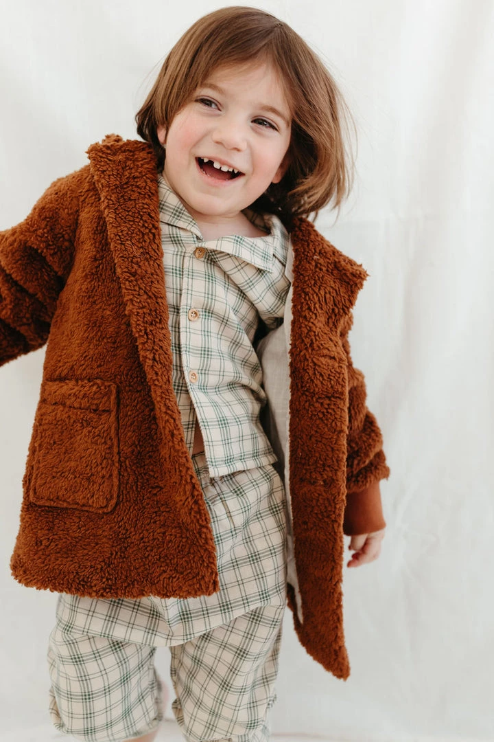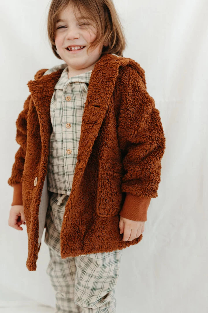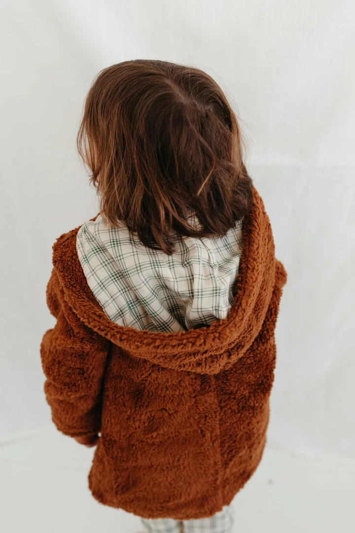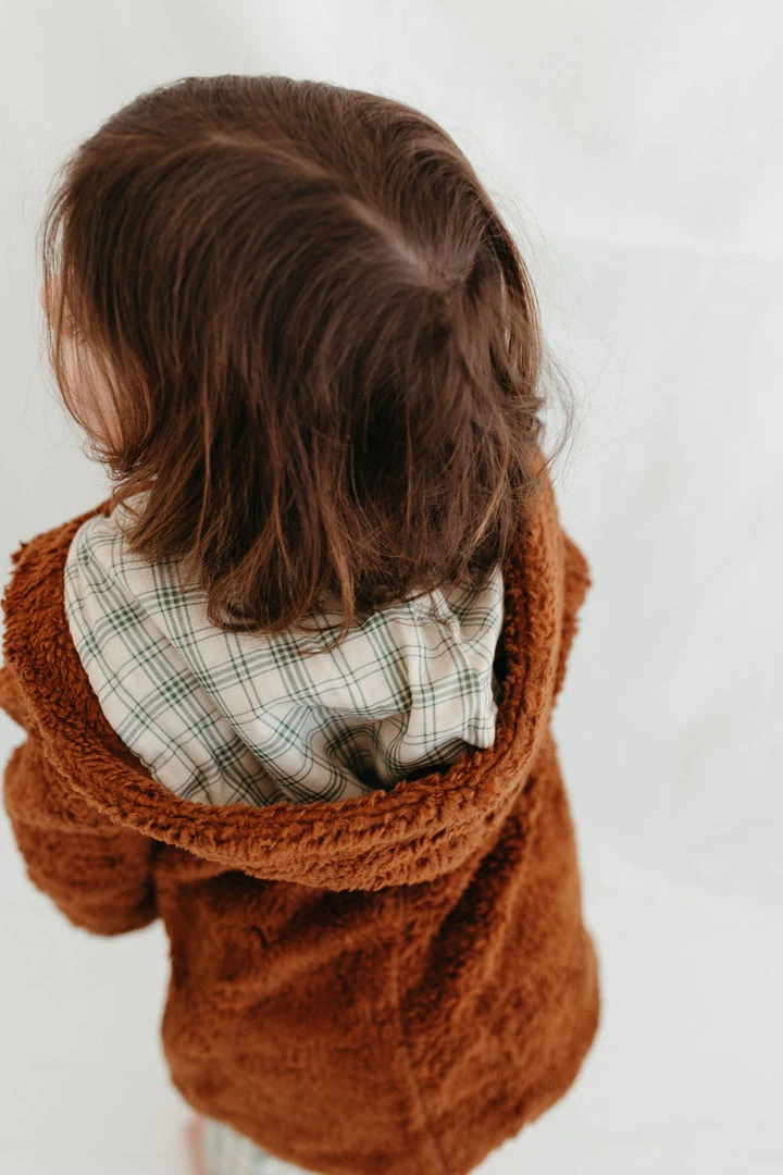 oversized cozy plush coat with long sleeves cuffed at the wrists, hip length, wooden button closure and pockets at the front, lined hood with gauze fabrication in our french plaid print!