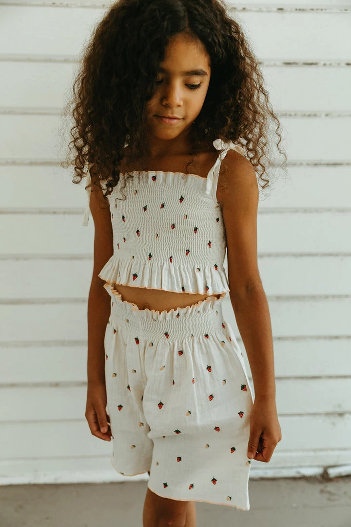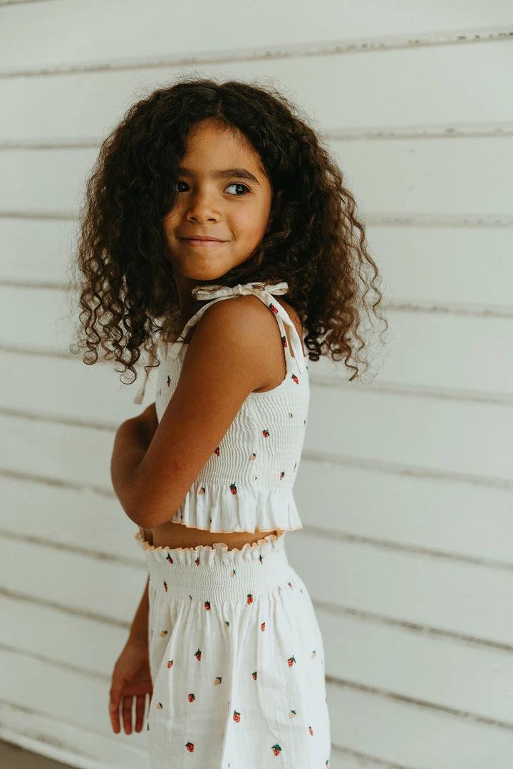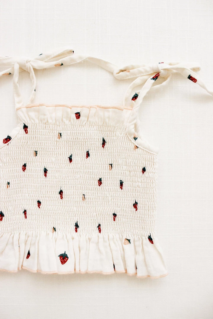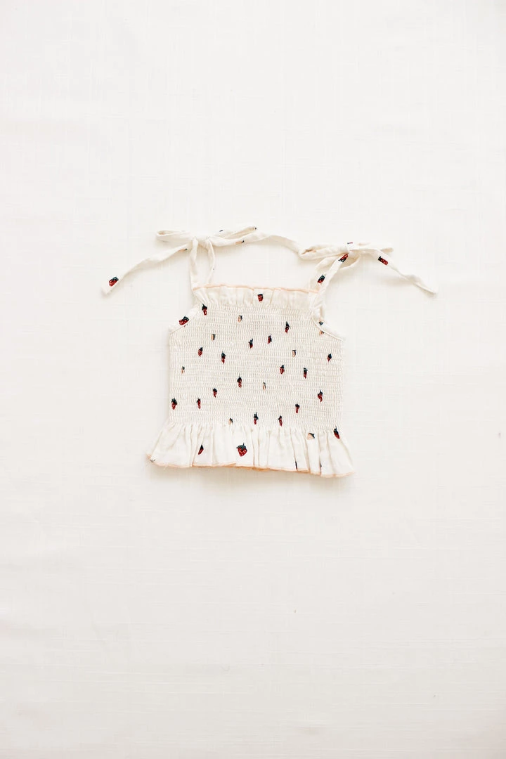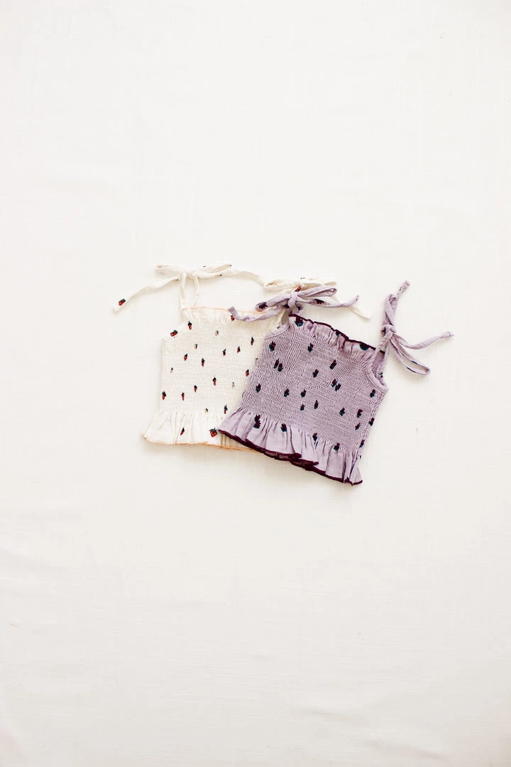 a fully smocked tank in a feminine silhouette with ruffled flounce at opposite ends of the hem in a fitted cropped style with adjustable ties at shoulder, perfect for pairing with our matching smocked culotte for a complete look
