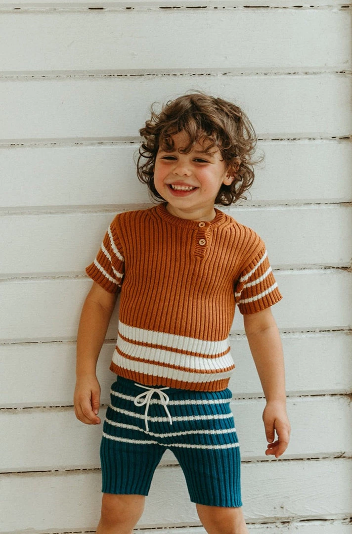 the heritage knit top in a slinky fun knit fabrication with practical essence making it the perfect wear everywhere top, features classic stripe detailing, ribbed texture throughout with a round neck design including functional wooden buttons at collar to assist with dressing