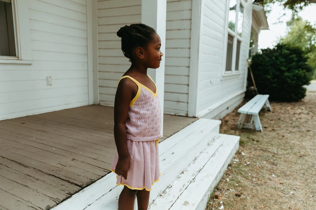 vintage pleated pull-on skirt in a ultra soft knit fabrication with a loose fit style, features a slightly flared cut ideal for twirling, contrasting hem detail and a cord tie for adjusting