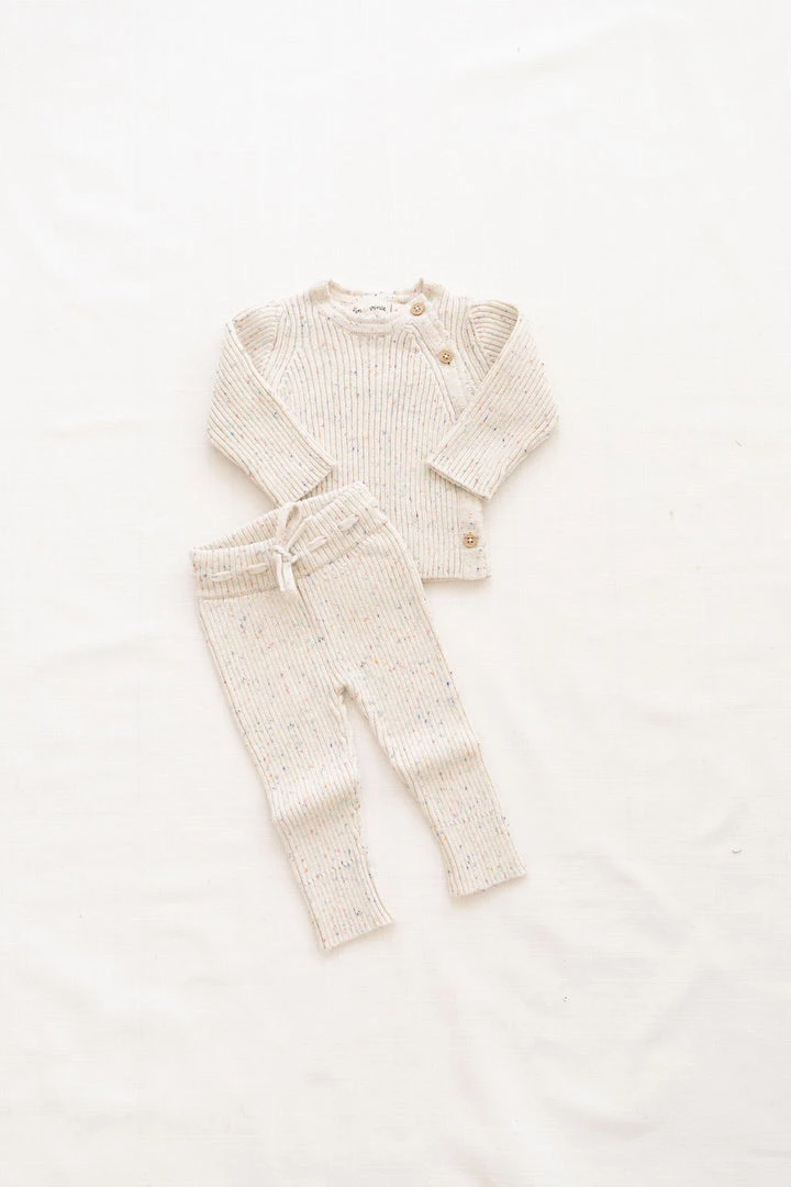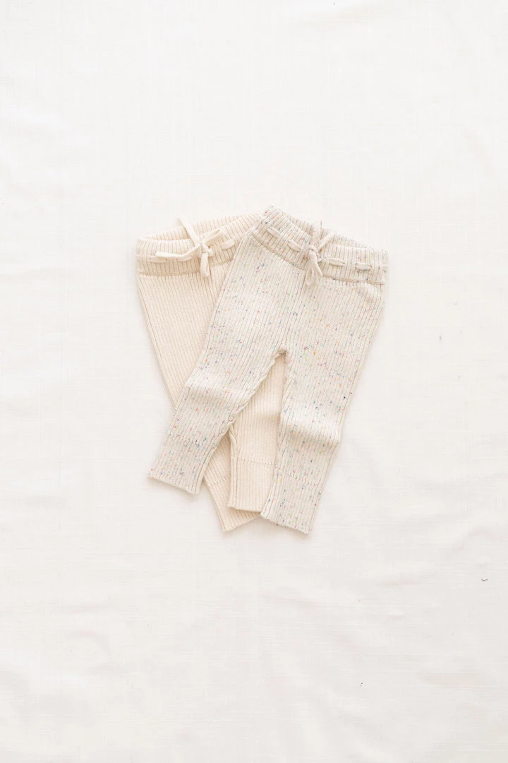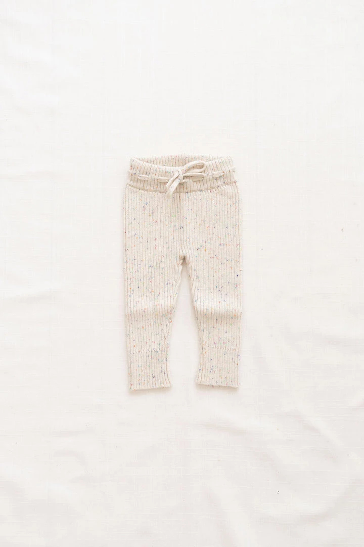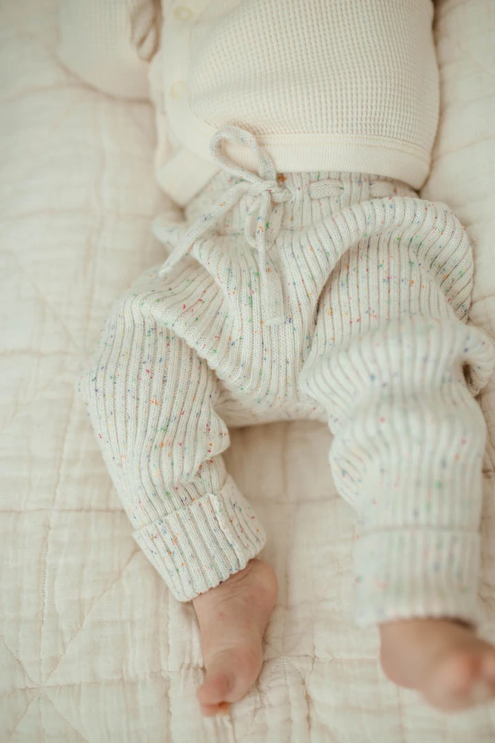 unisex design in our ultra soft luxury knit pant with unique rib detailing throughout, tailored to ensure the most comfortable fit, flexible fabric makes getting around easy for the littlest movers, has an elastic drawstring waistband for adjustment, confetti decorative details, pairs with our ribbed knit cardigan