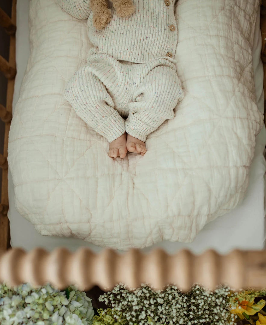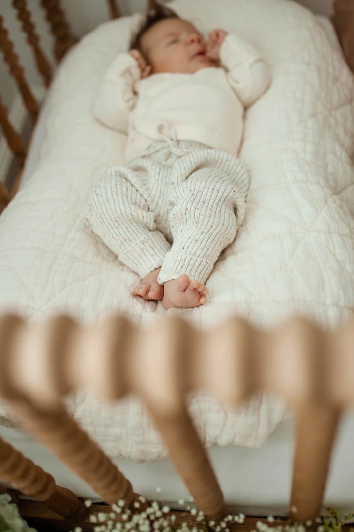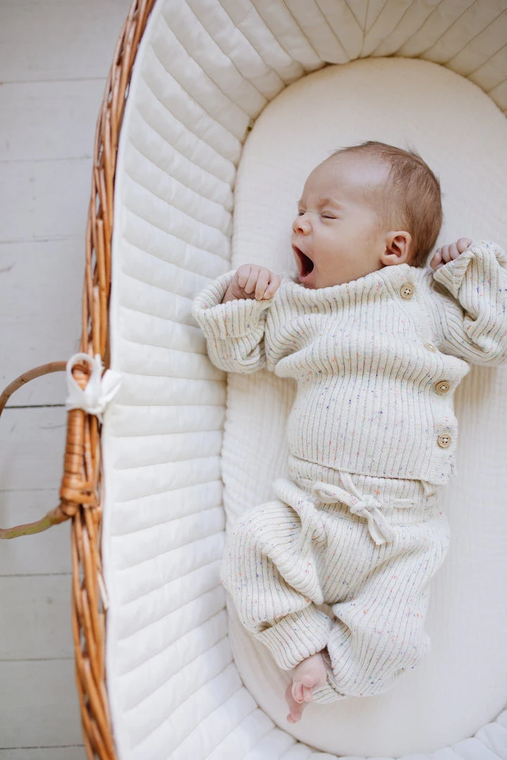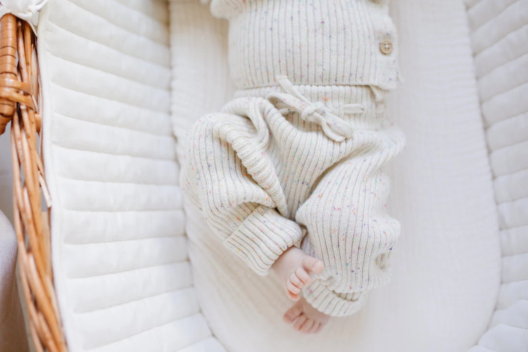 unisex design in our ultra soft luxury knit pant with unique rib detailing throughout, tailored to ensure the most comfortable fit, flexible fabric makes getting around easy for the littlest movers, has an elastic drawstring waistband for adjustment, confetti decorative details, pairs with our ribbed knit cardigan