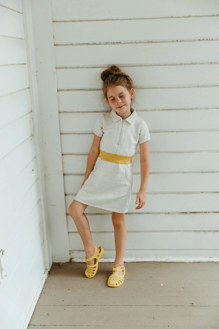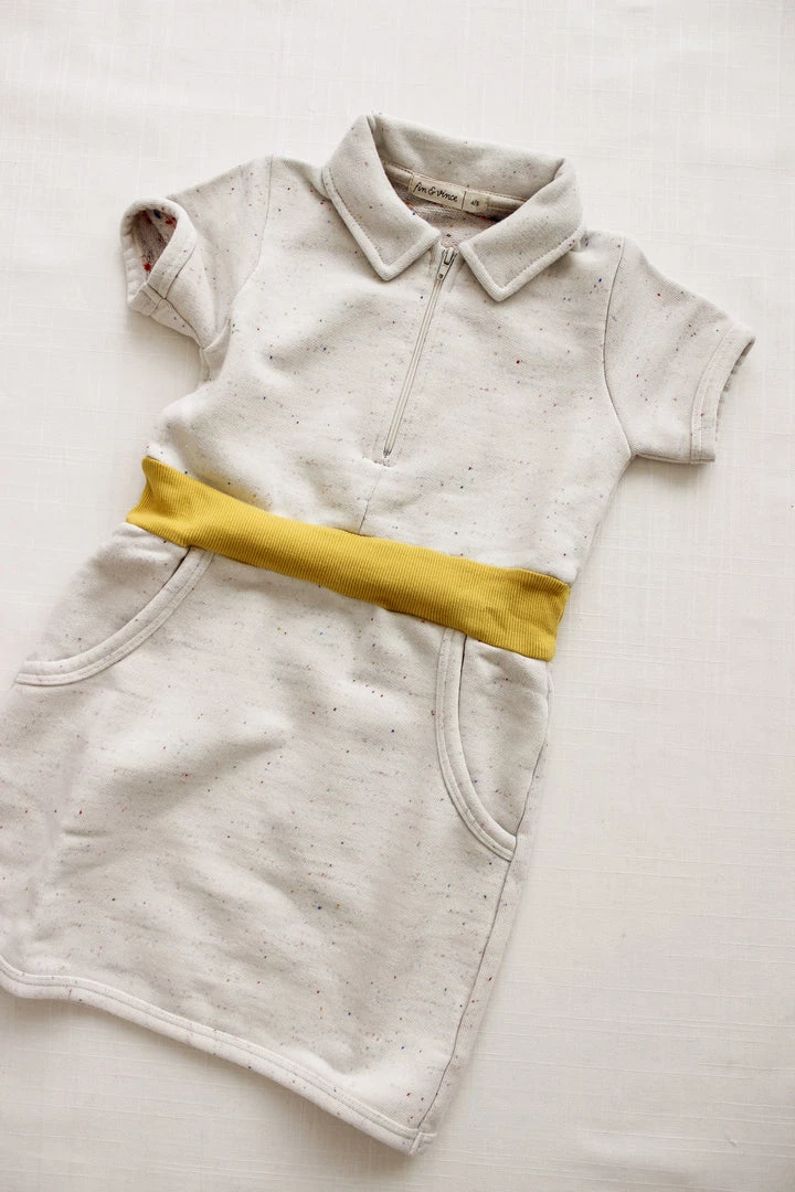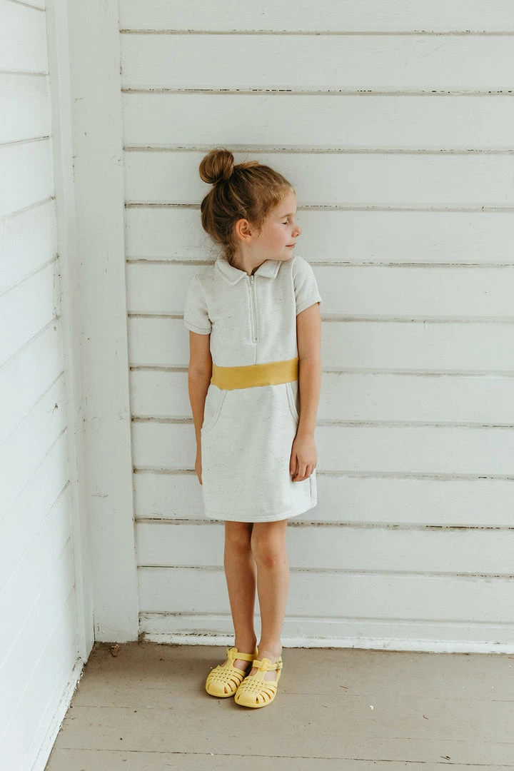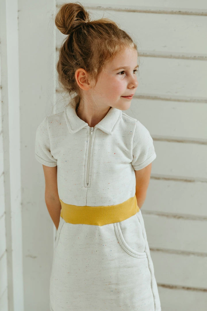 knee length collared dress with front center half zipper, contrasting waistband for added dimension and functioning front pockets, terry cloth fabrication making this piece perfect for family vacations seaside and school days alike