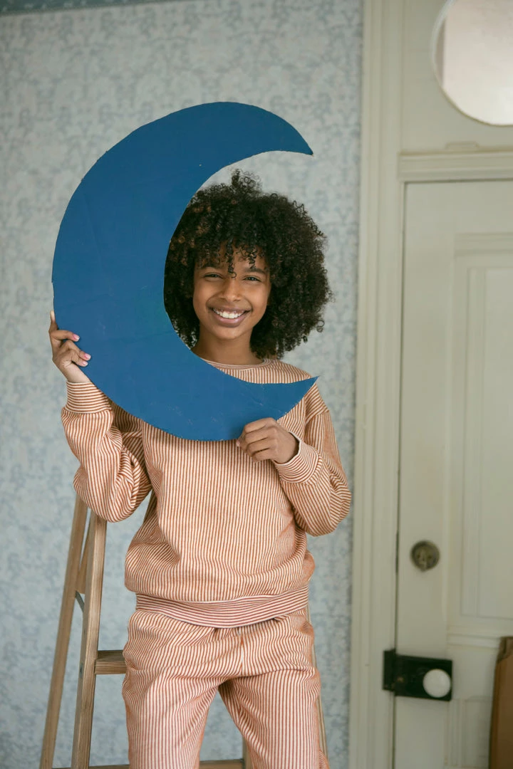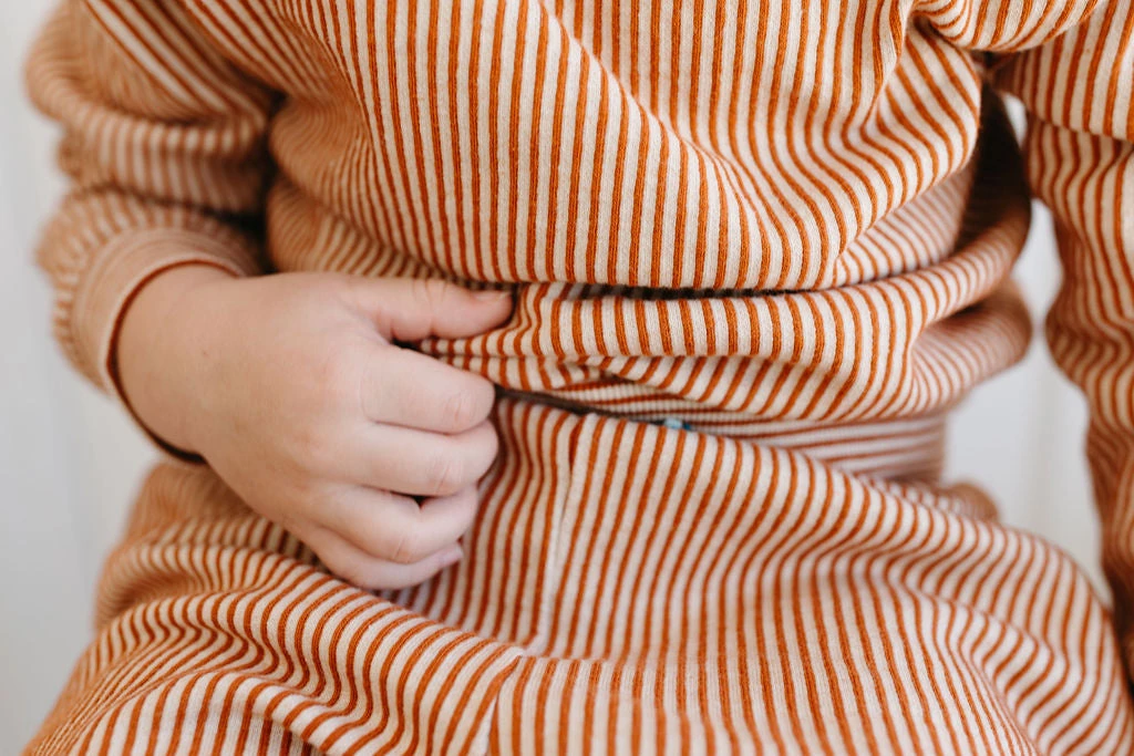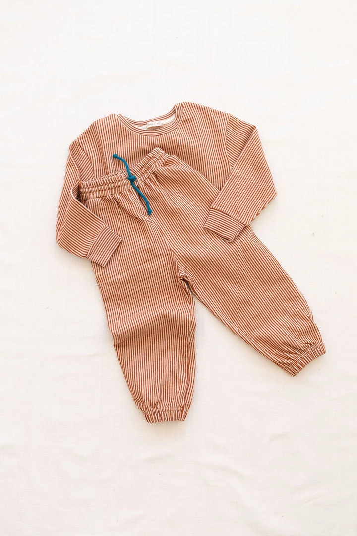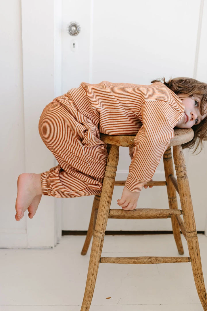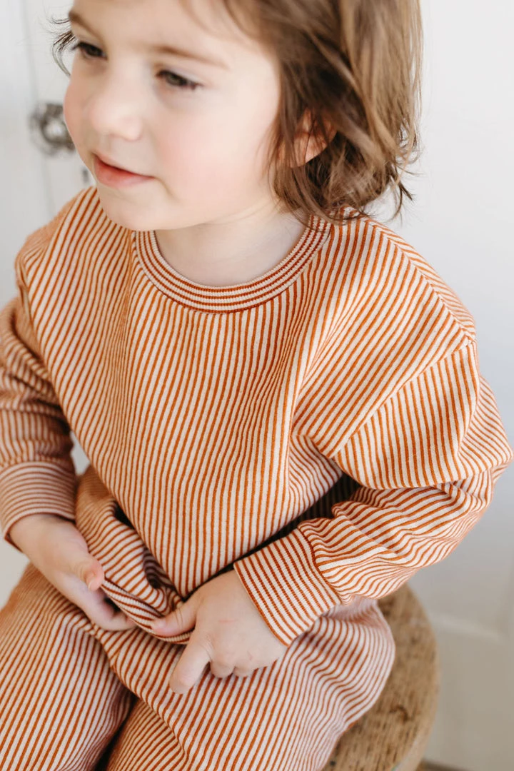 french terry softness in our effortless crew neck pullover sweater, gorgeous hazelnut pinstripe details and banded hem for added shape