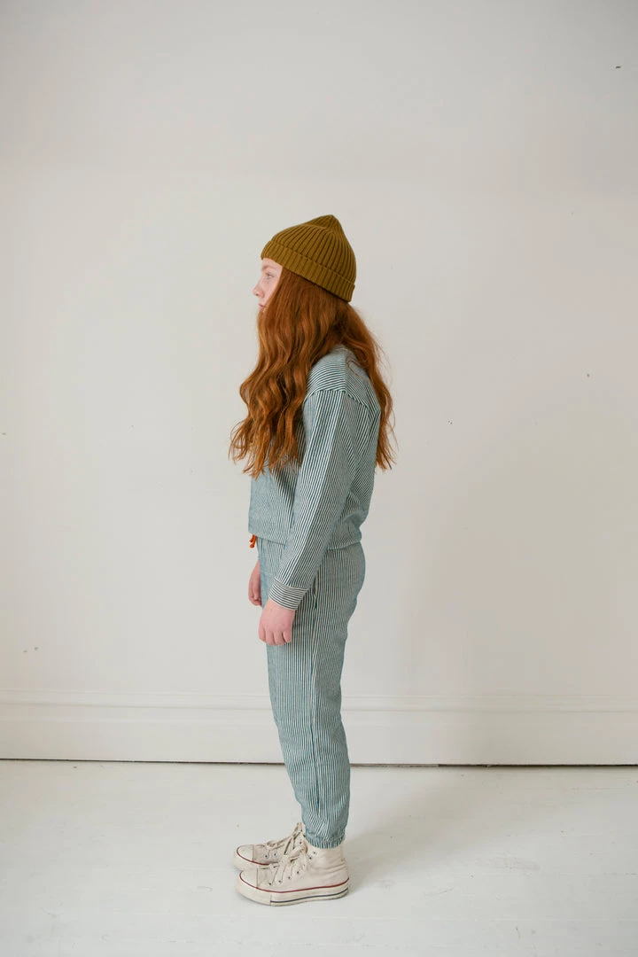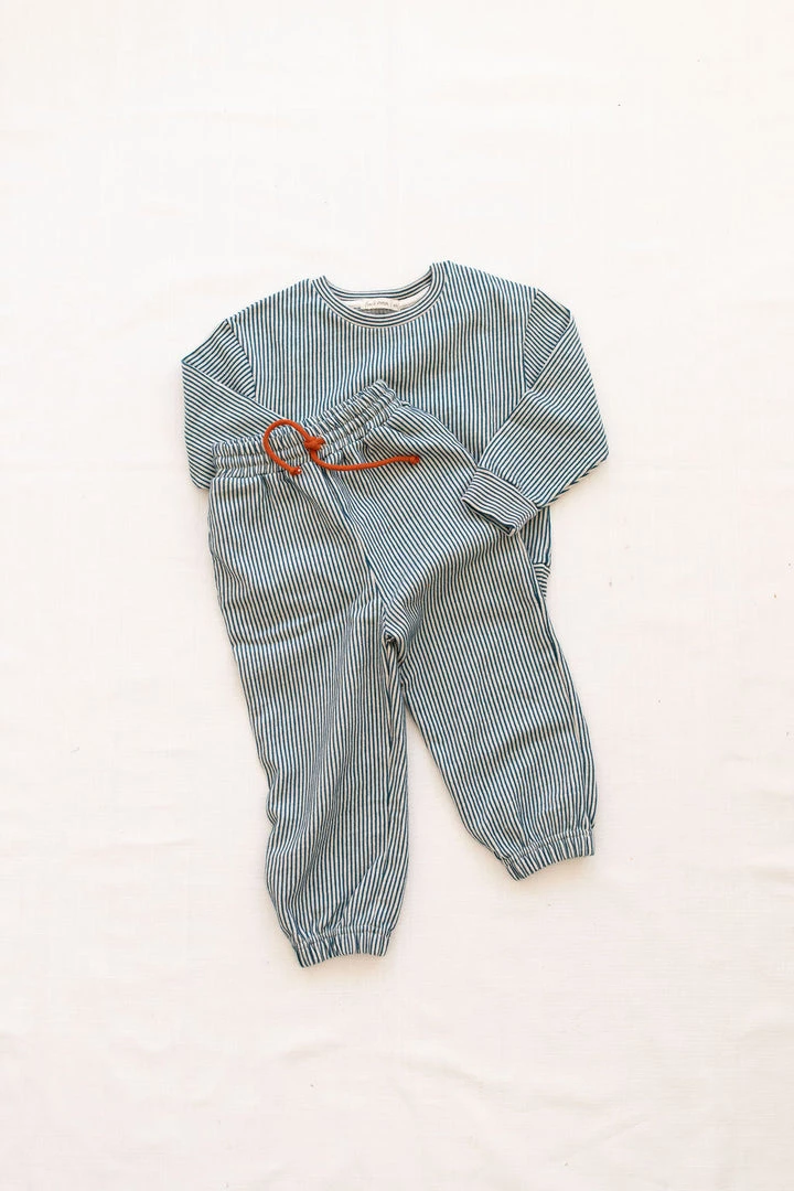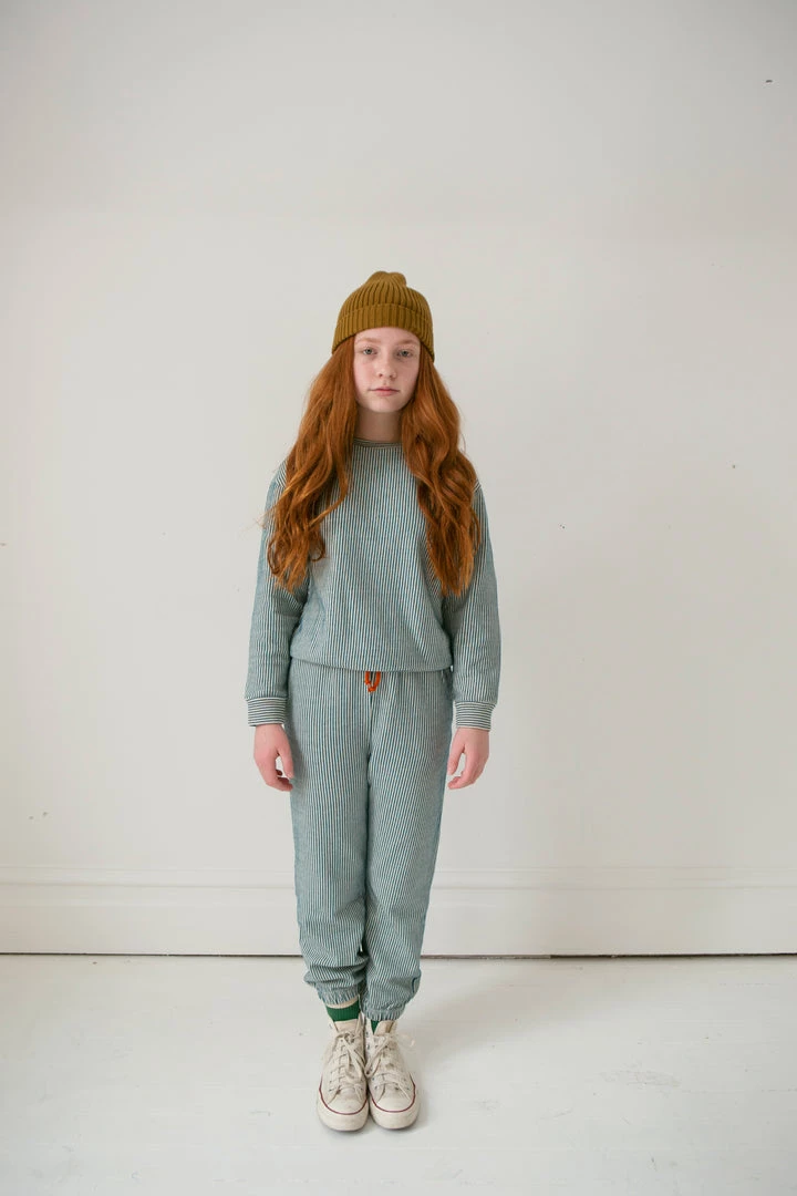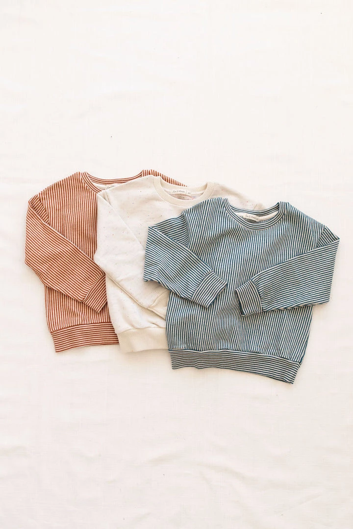 french terry softness in our effortless crew neck pullover sweater, gorgeous ocean pinstripe details and banded hem for added shape