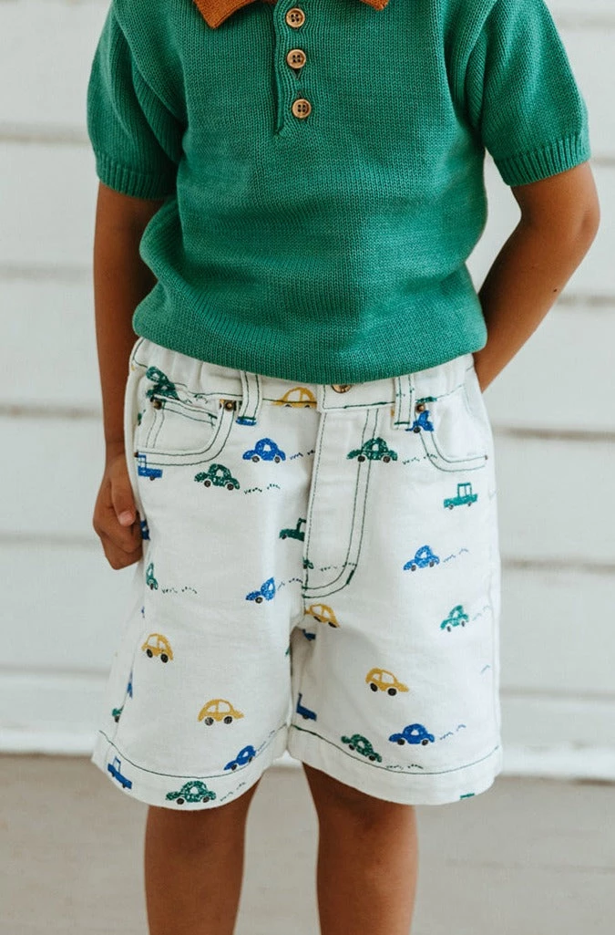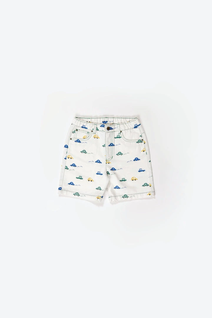 retro-inspired jean short featured in a forever timeless straight-leg design, four practical pockets, adjustable waistband and contrasting stitch with all over car print to coordinate with season favorites, stamped with fin & vince logo tab