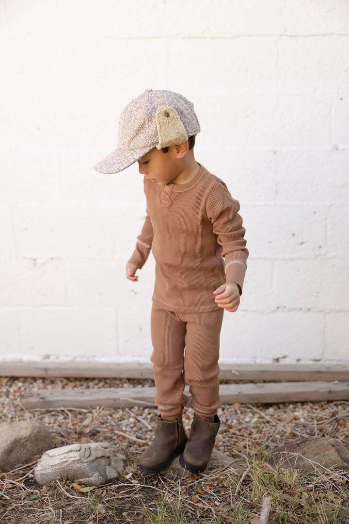tried and true, our signature waffles are back in 6 new solid colorways to get you excited! features a functioning button at the collar to assist with dressing, contrast stitching on snug cotton cuffs, completed with a durable mini waffle knit fabrication that not only looks great but can withstand the test of little ones and the washing machine alike! layer these for added warmth or wear alone, either way you’ll be glad to have collected these gender neutral long-lasting favorites! pair with the matching waffle home pant for a complete look!