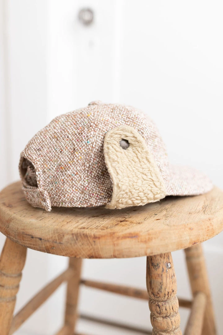 structured sherpa lined baseball cap in twill fabrication, features a soft top and curved brim, an adjustable velcro strap at back of neck and optional warming ear muffs, securely snaps in place when not in use