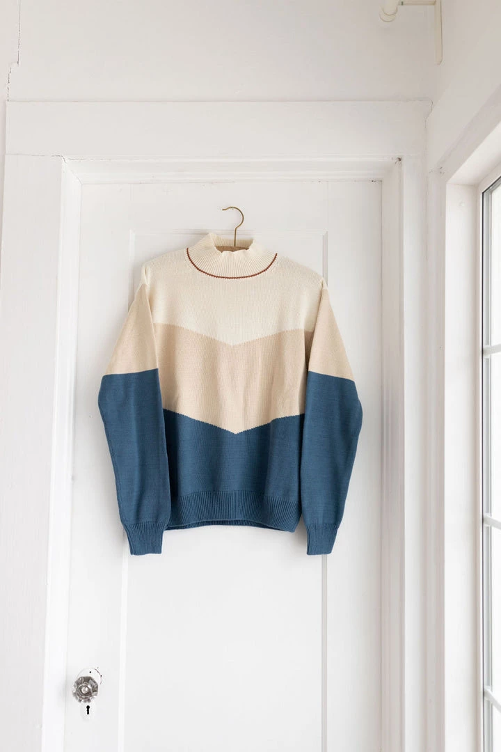 slouchy mock sweater with abstract pattern and cuffed wrists