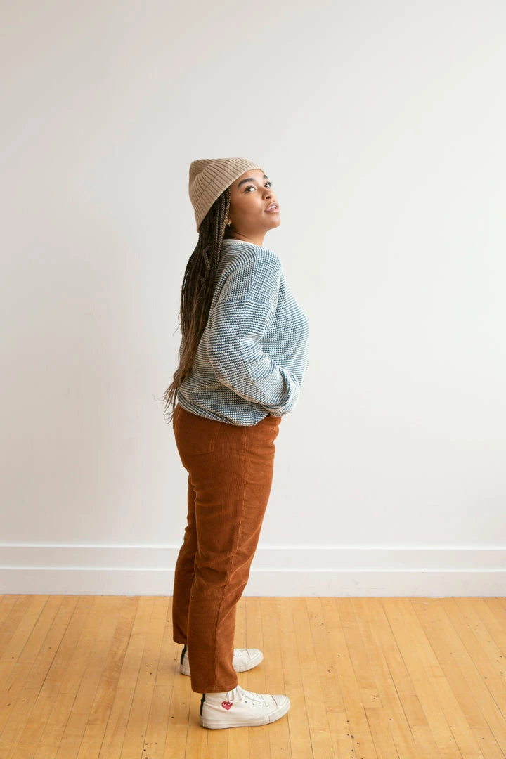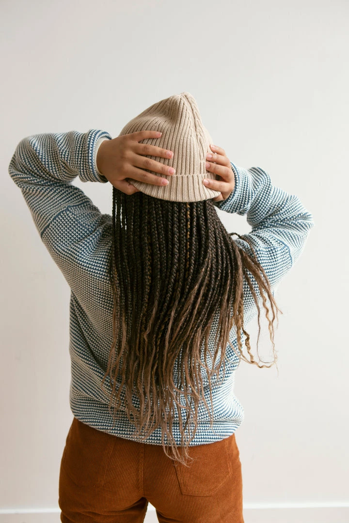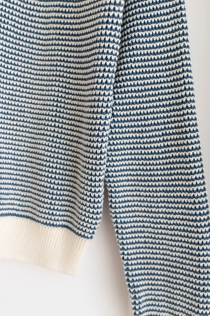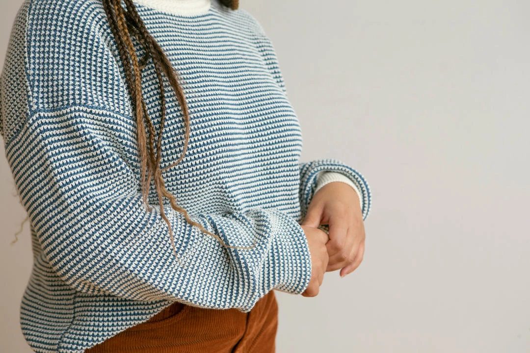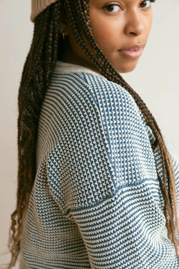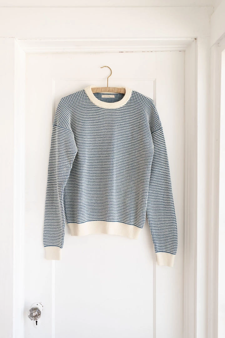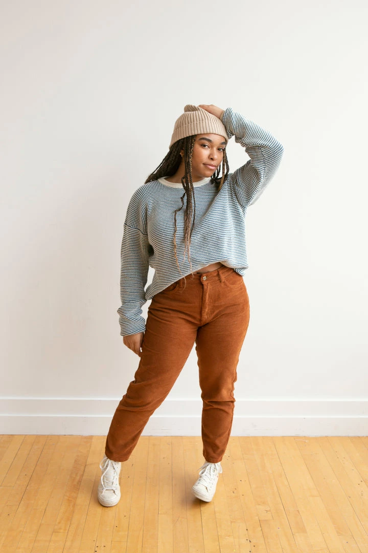 medium weight knit featuring a unique looped weave-like textured fabric and pullover function, contrasting neckline, wrists and bottom hem for added depth, also available in children’s sizing for a matching mommy and me moment