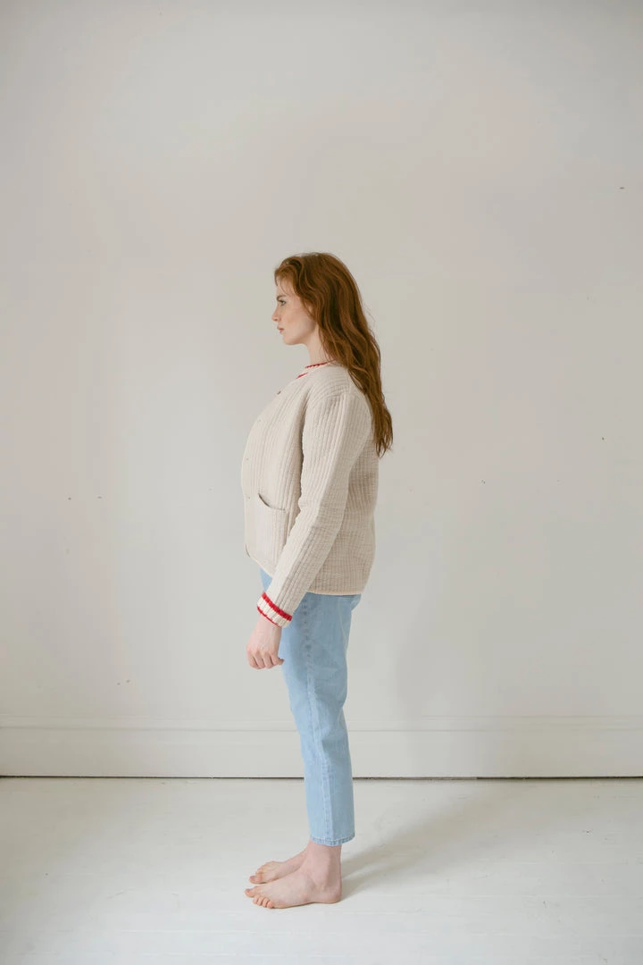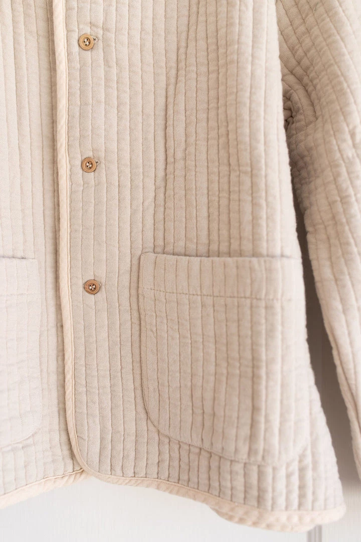 appealing quilted fabrication transitions well throughout the seasons, rounded hem for dimension, complimented with wooden buttons and convenient double front pockets