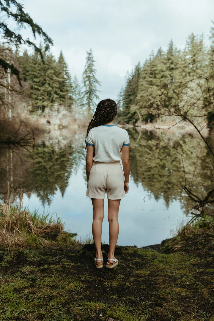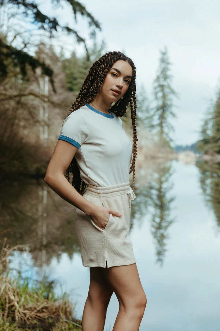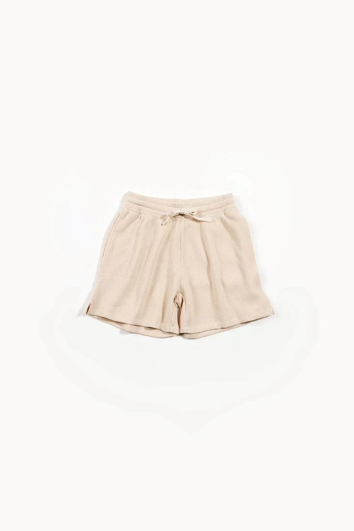classic track style shorts in a comfy and cozy waffle fabrication tailored to ensure the most comfortable fit and retro look, has a cord tie with gentle elastic waist for adjusting