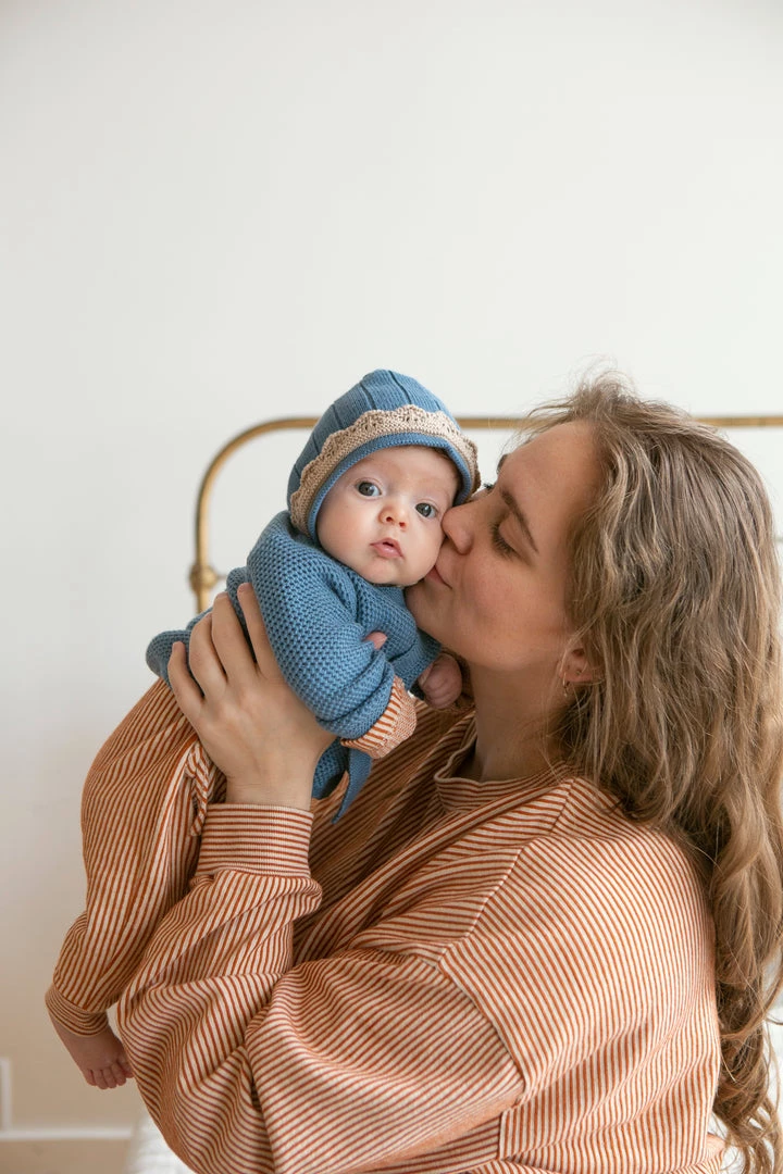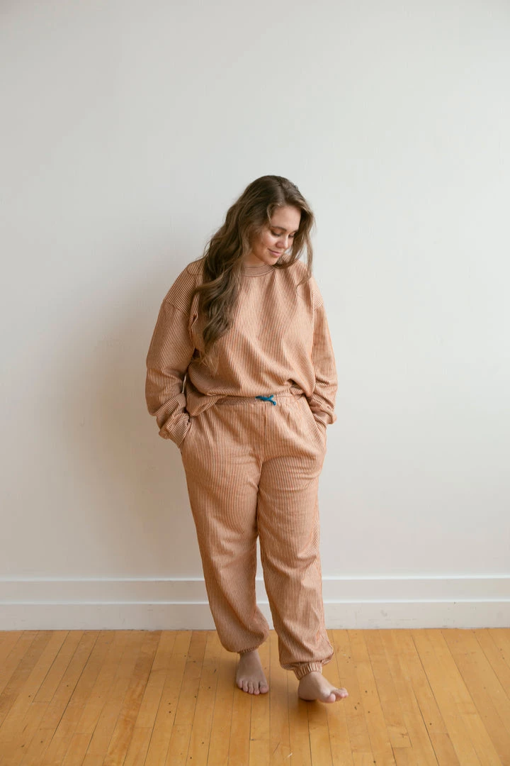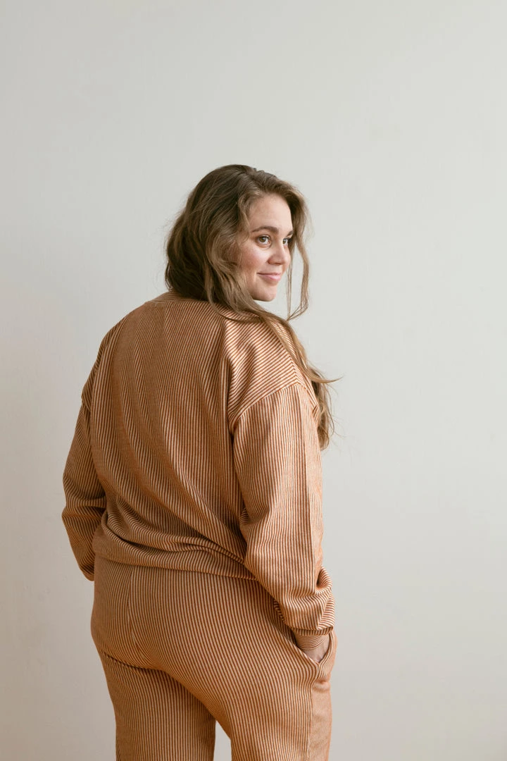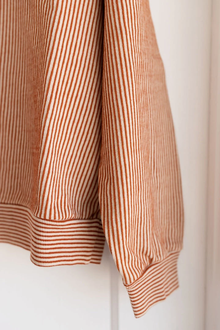 french terry softness in our effortless crew neck pullover sweater, gorgeous hazelnut pinstripe details and banded hem for added shape