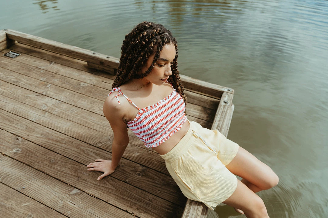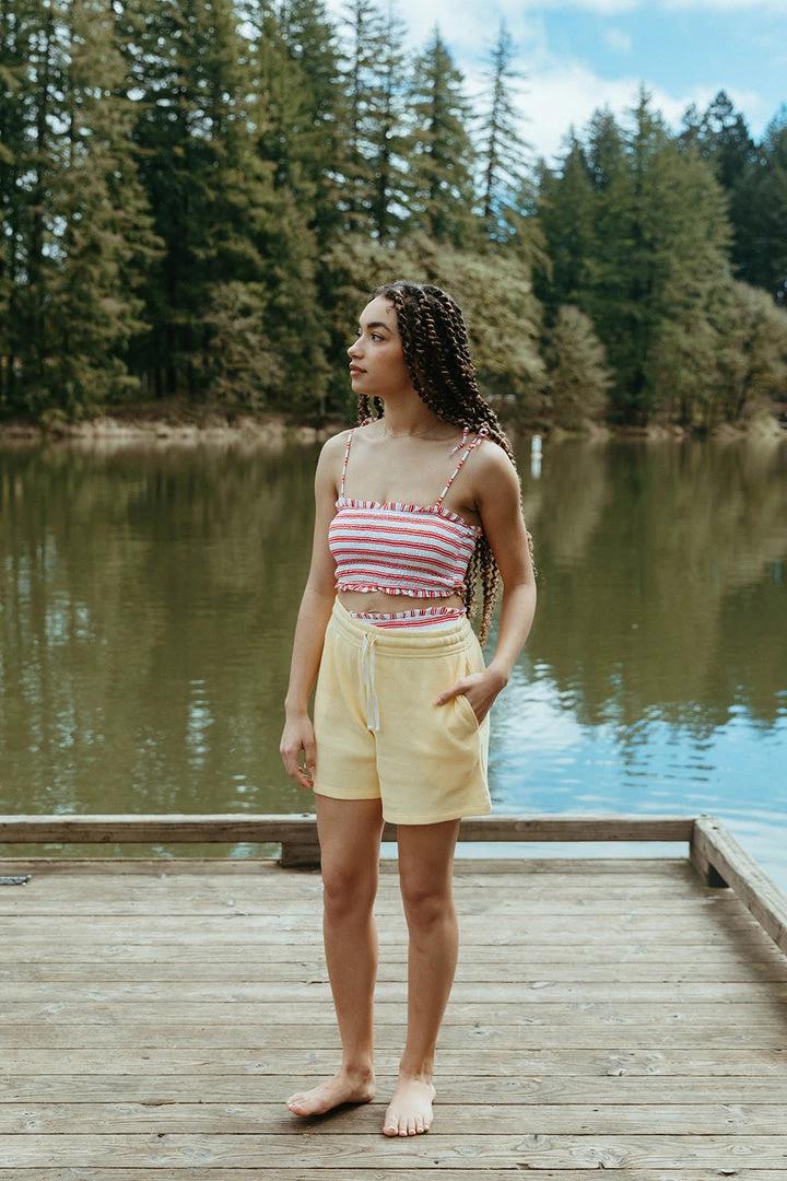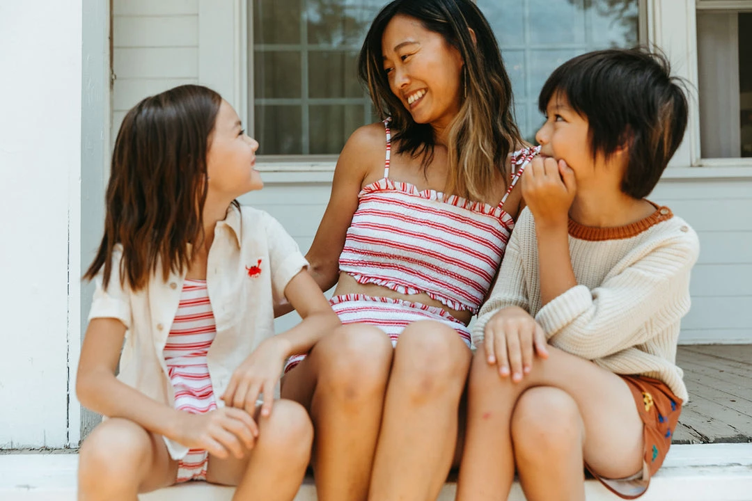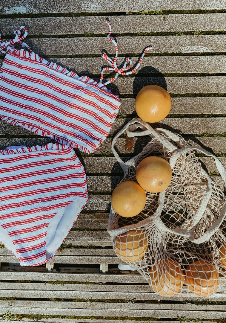 fully smocked youthful two-piece bikini includes tank with adjustable straps paired with a smocked high waist bottom highlighted in a fun print to match your mini splashing in style, rest assured this set offers excellent uv protection from the elements