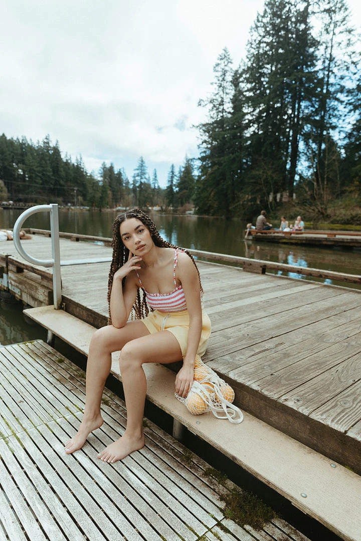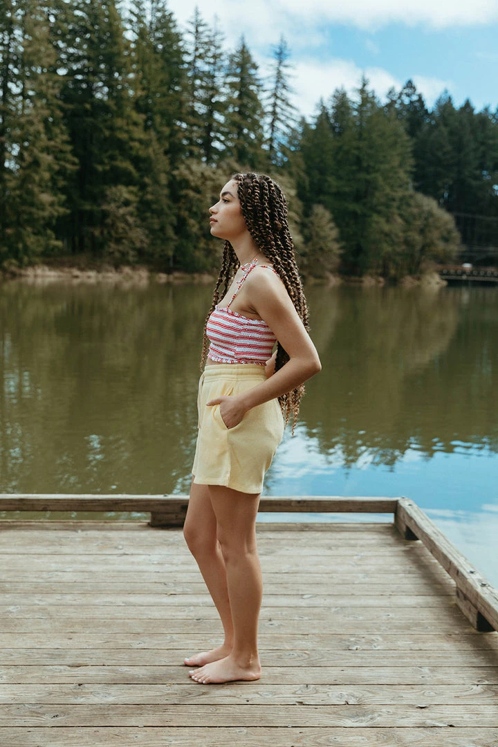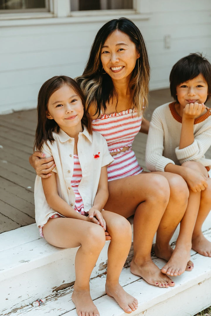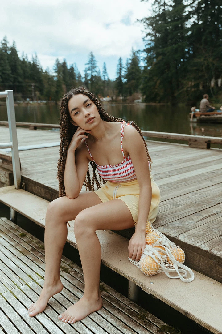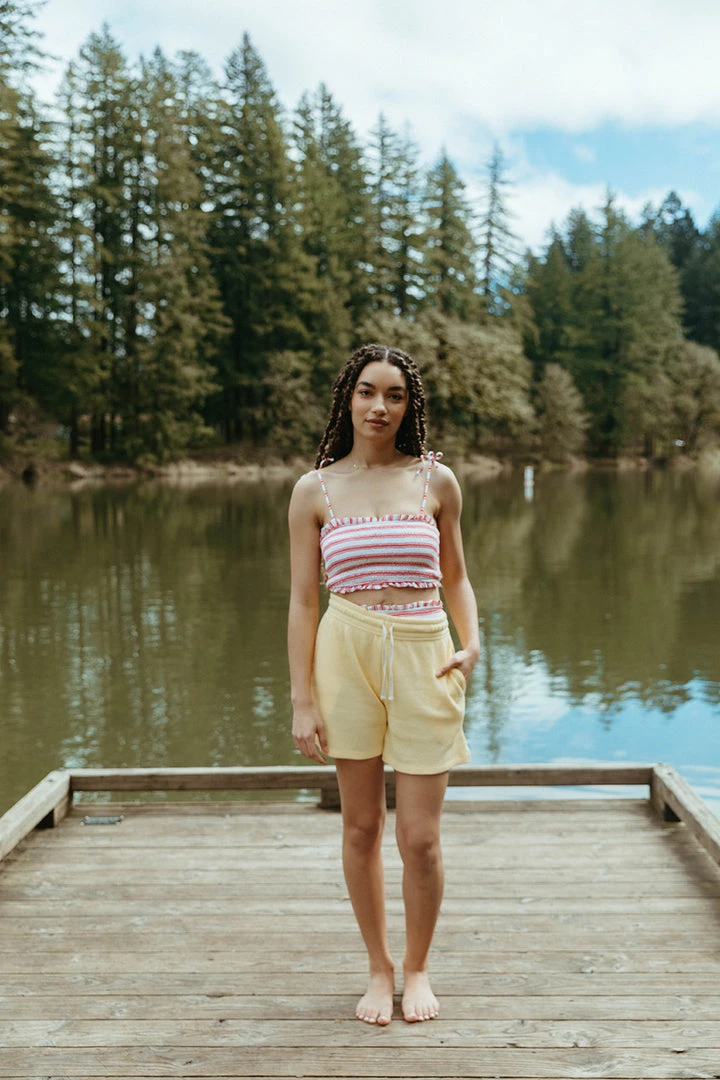 fully smocked youthful two-piece bikini includes tank with adjustable straps paired with a smocked high waist bottom highlighted in a fun print to match your mini splashing in style, rest assured this set offers excellent uv protection from the elements