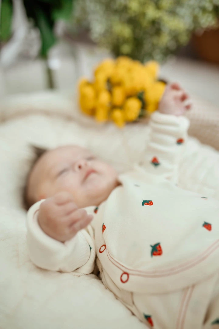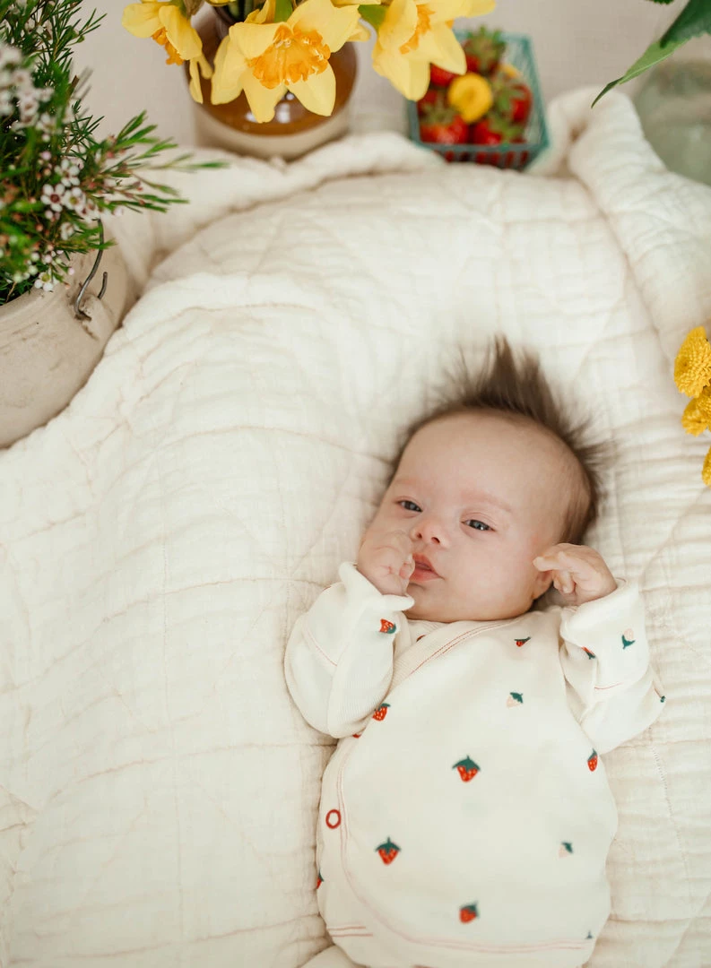 designed in our gentle cotton fabric for ultimate comfort against delicate skin, the wrap style features button closure on both the inside and out to hold its shape and assists in speedy changes, fold over mittens that protect from new sharp nails or colder temperatures, pair with our matching home pant style for a complete look